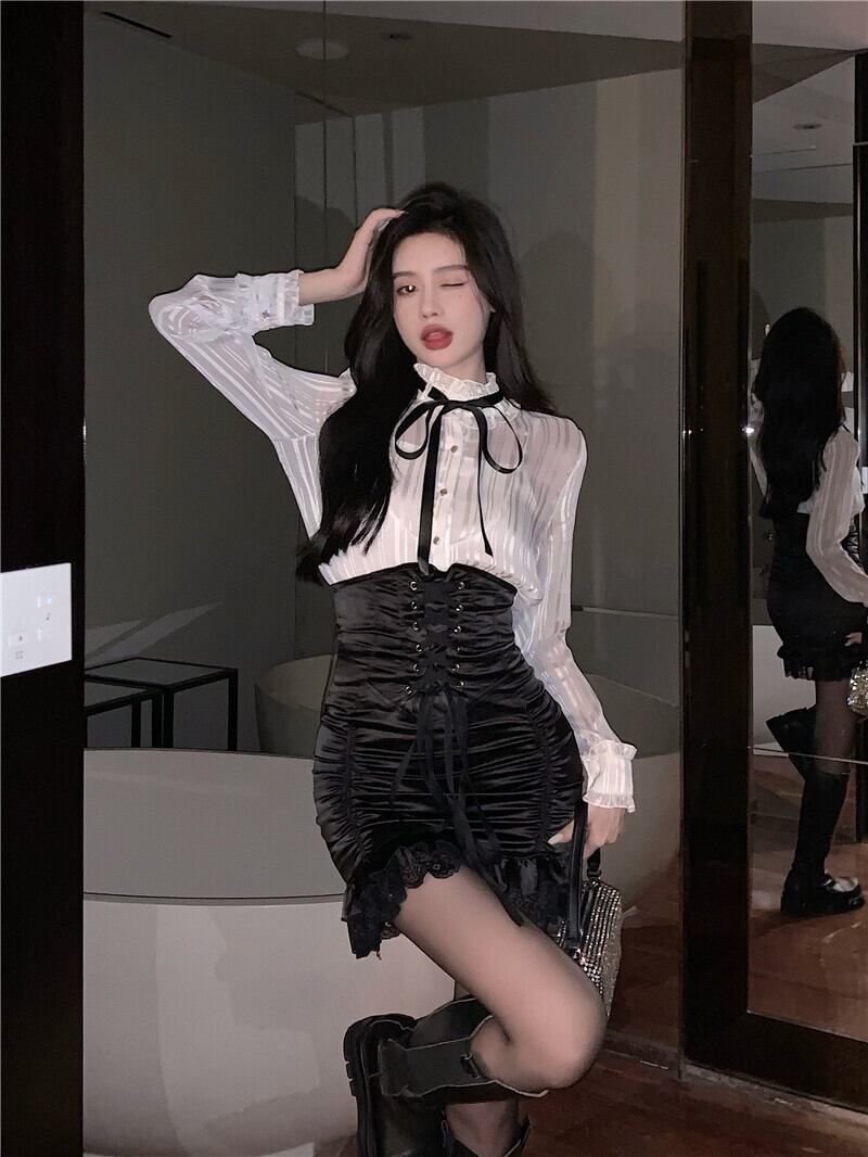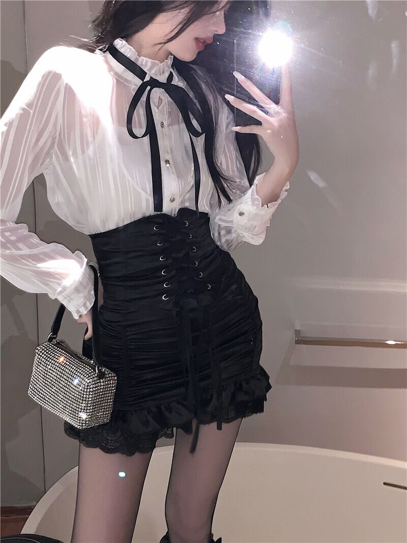 色:白いシャツ(サスペンダー付き),黒のハイウエストスカート