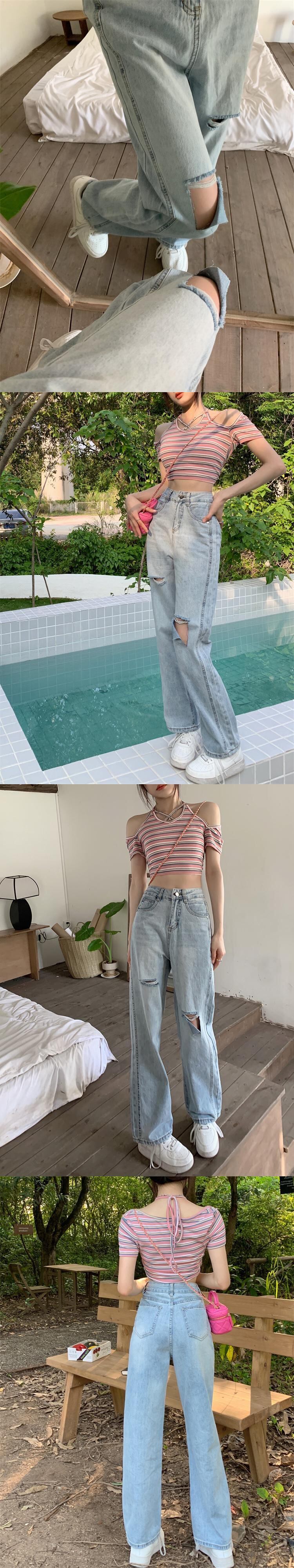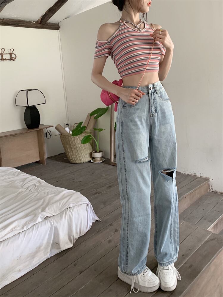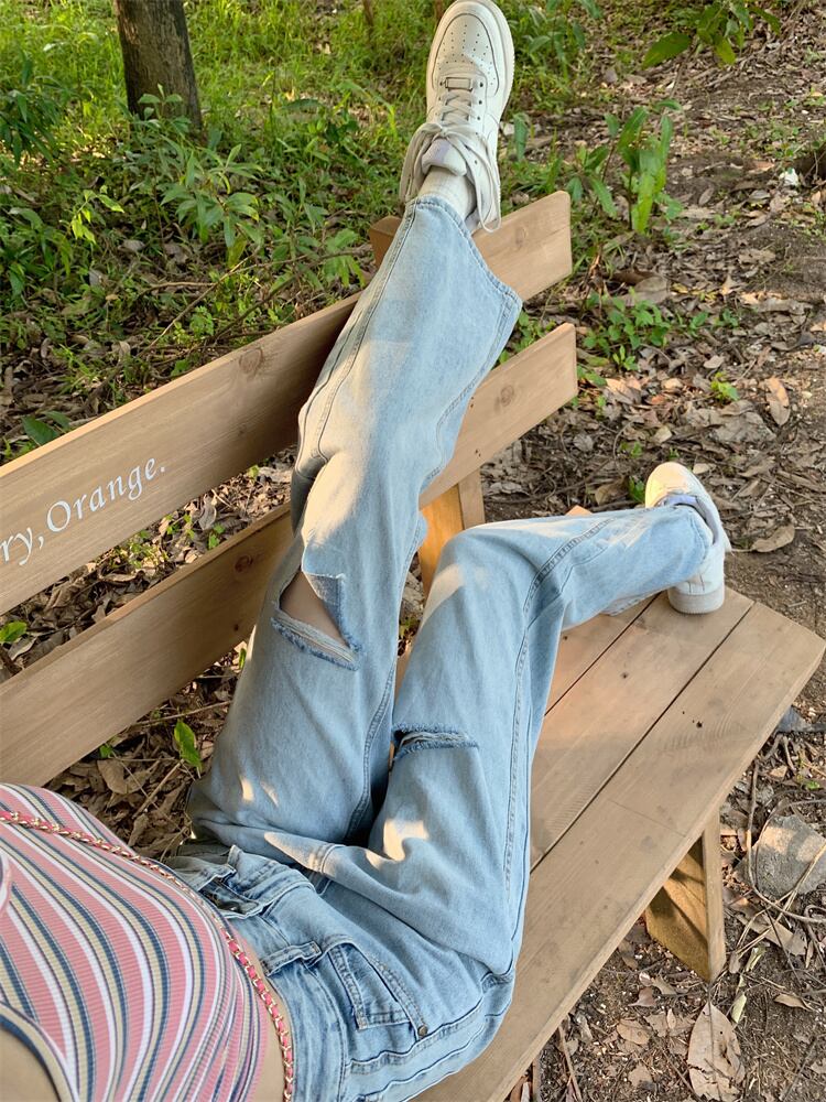 破れたジーンズレディースライトブルーオールドレトロワイドレッグパンツサマーハイウエストルーズストレートスリムパンツ ハイウェスト 夏物 ワイドパンツ bstraw44137717195 | beaute25