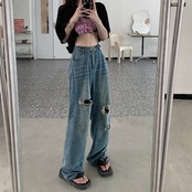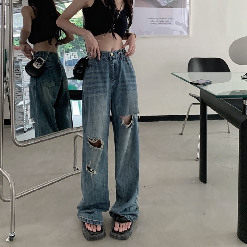 破れたジーンズの女性の夏の薄いセクションブルールーズレトロワイルドハイウエストは薄いストレートワイドレッグパンツパンツでした ハイウェスト サマー 夏物 ワイドパンツ bstraw83393631688 | beaute25