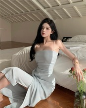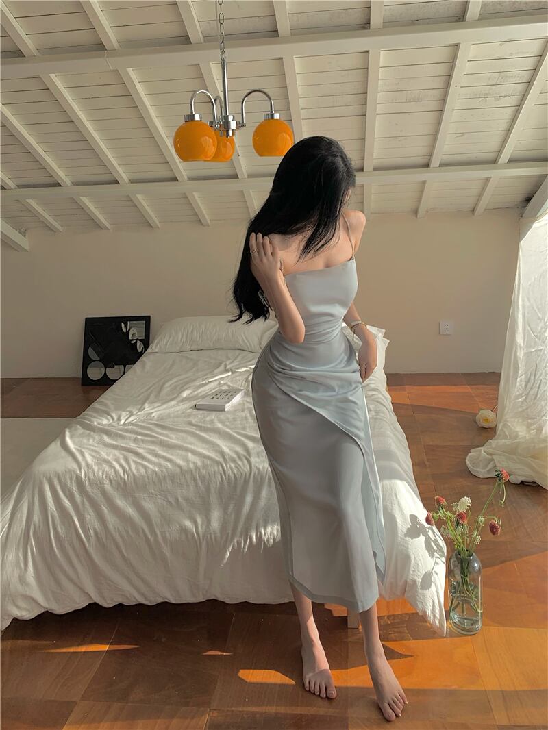 フレンチサテンサスペンダードレス女性の夏の純粋な欲望は、背中のワンショルダーホルターネックミドル丈ウエストスリムスカートを見せたい サマー 夏物 ピュア bstraw29086944253 | beaute25
