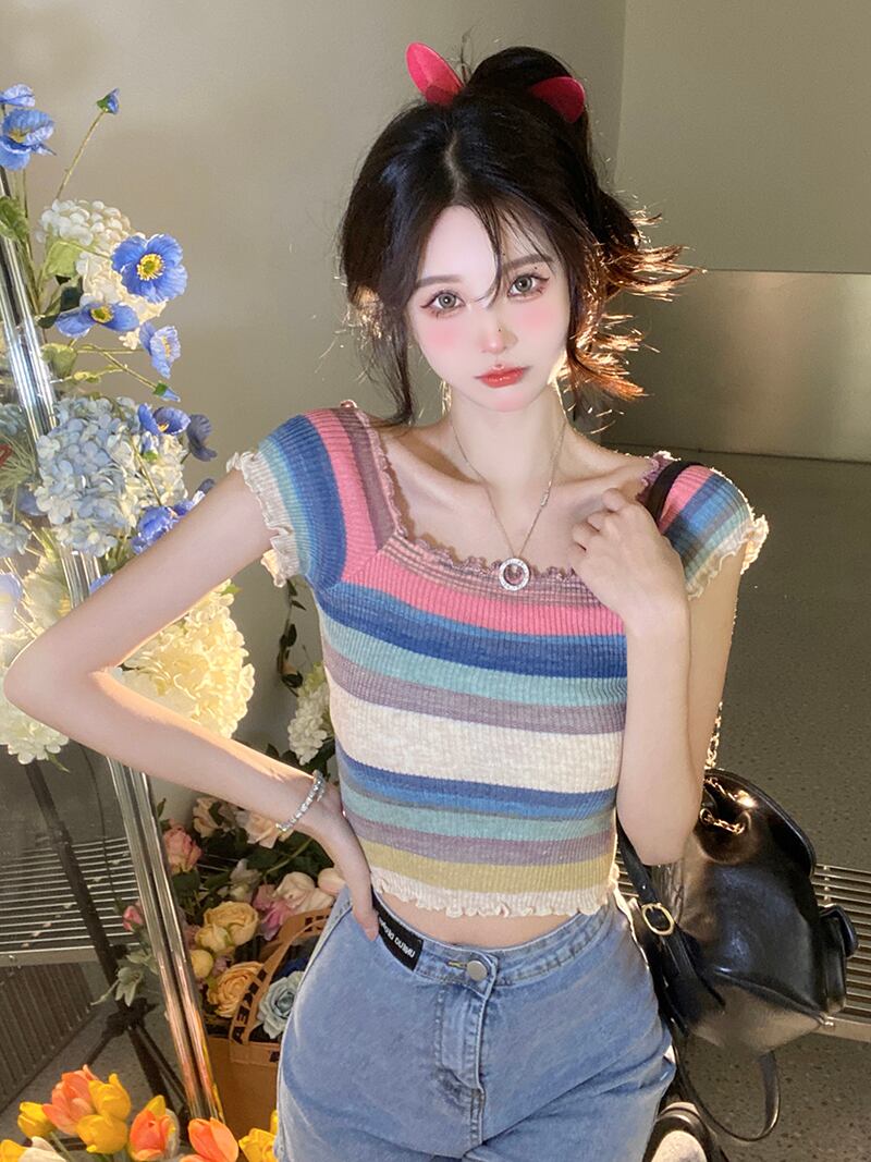 ストライプの菌エッジ半袖スクエアネックTシャツレディース2022夏の新しいスリムフィットショートトップボトミングシャツ サマー 夏物 スクウェア bstraw63473315593 | beaute25