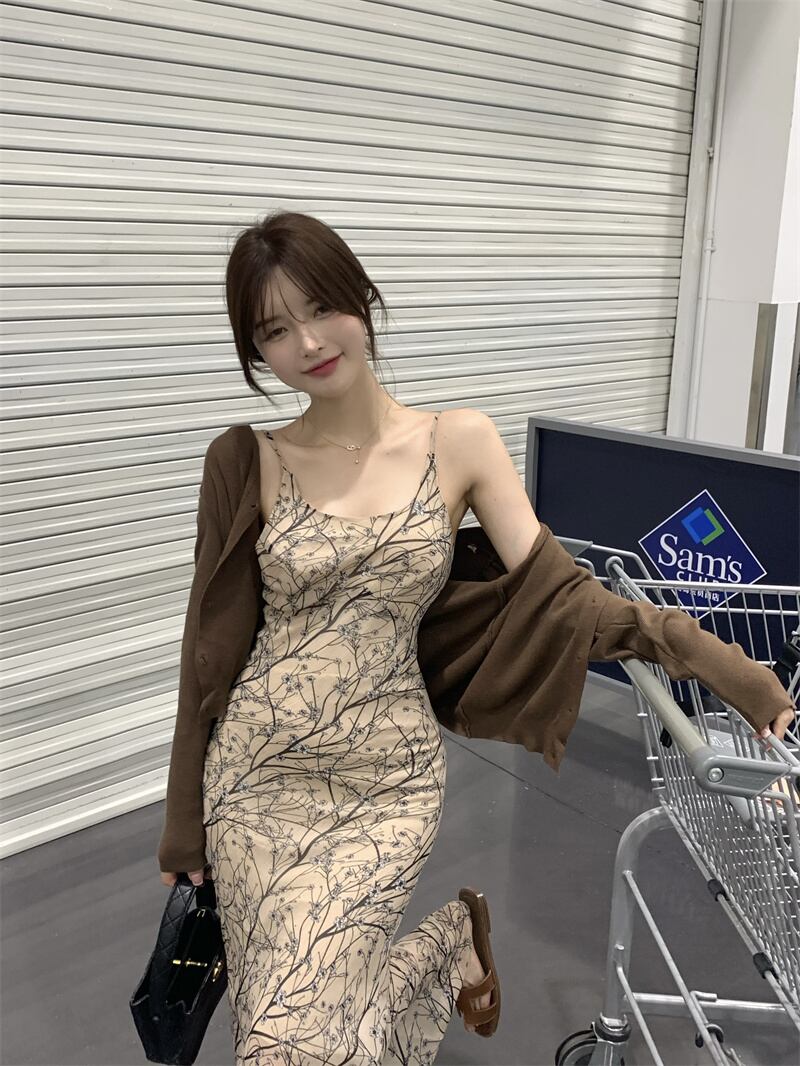 色:花柄ドレス,コーヒー色のカーディガン
