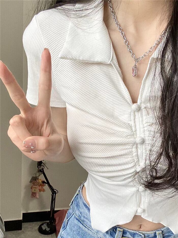 ホワイトポロカラー半袖Tシャツレディースサマースウィートピュアなスリムでスリムなシックカジュアルイレギュラートップへの欲求 大人ガーリー キュート 夏物 bstraw58526990427 | beaute25