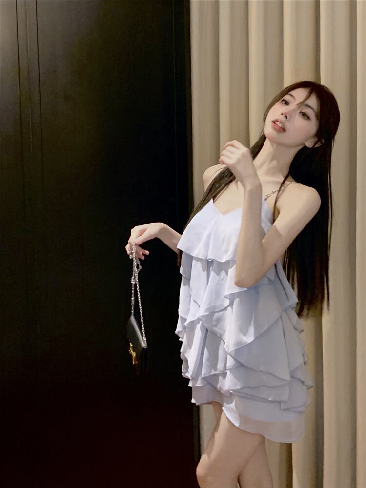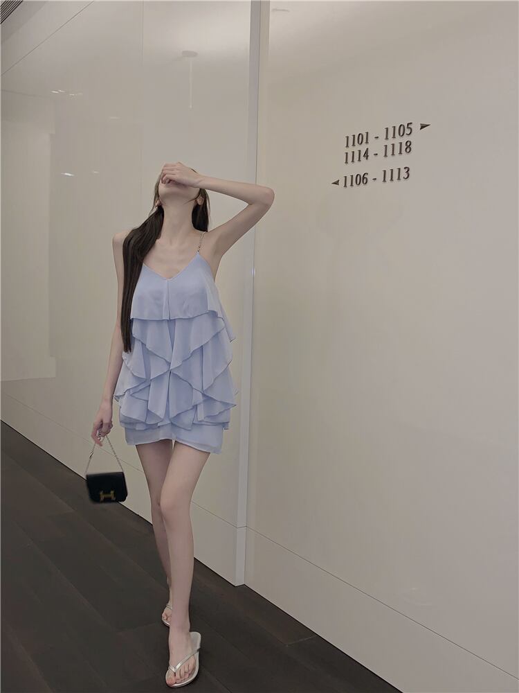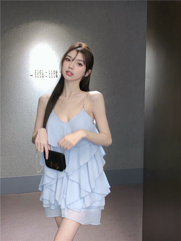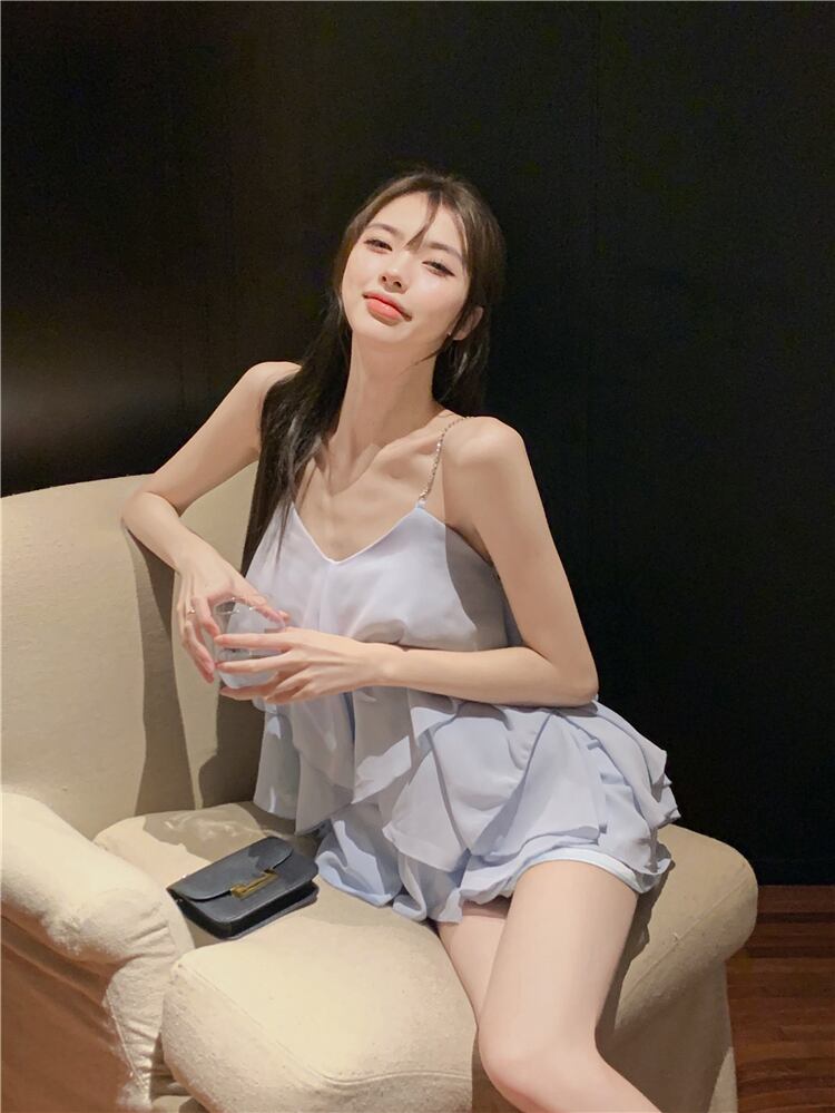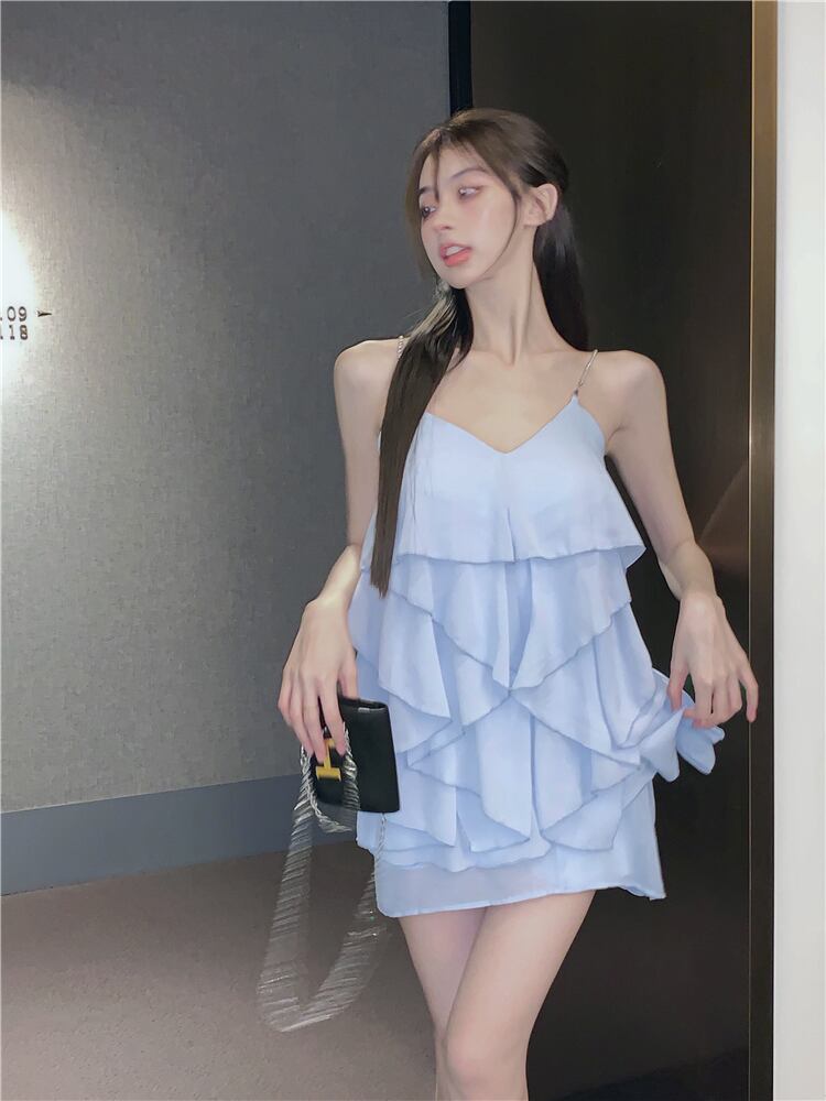 純粋な欲望のサスペンダードレス女性の夏のミルクブルー蓮の葉甘いVネックセクシーなルーズシックなショートスカート 大人ガーリー スウィート キュート カジュアル サマー 夏物 bstraw98978068865 | beaute25