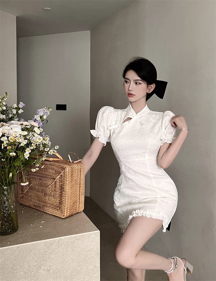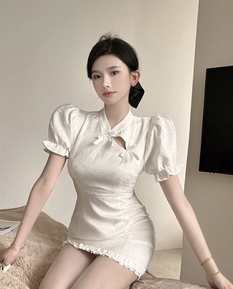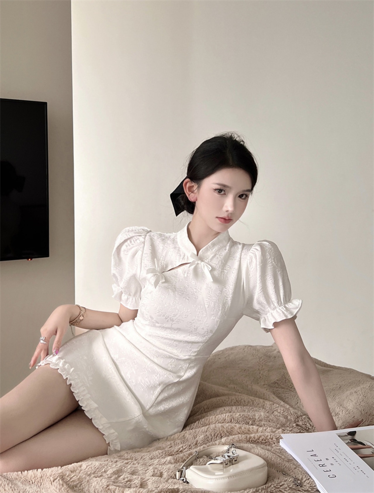 チャイナスタイルの改良されたチャイナドレス半袖ドレス女性の夏の甘い気質セクシーな弓ウエストショートスカート リボン 大人ガーリー スウィート キュート カジュアル サマー 夏物 bstraw30041080952 | beaute25