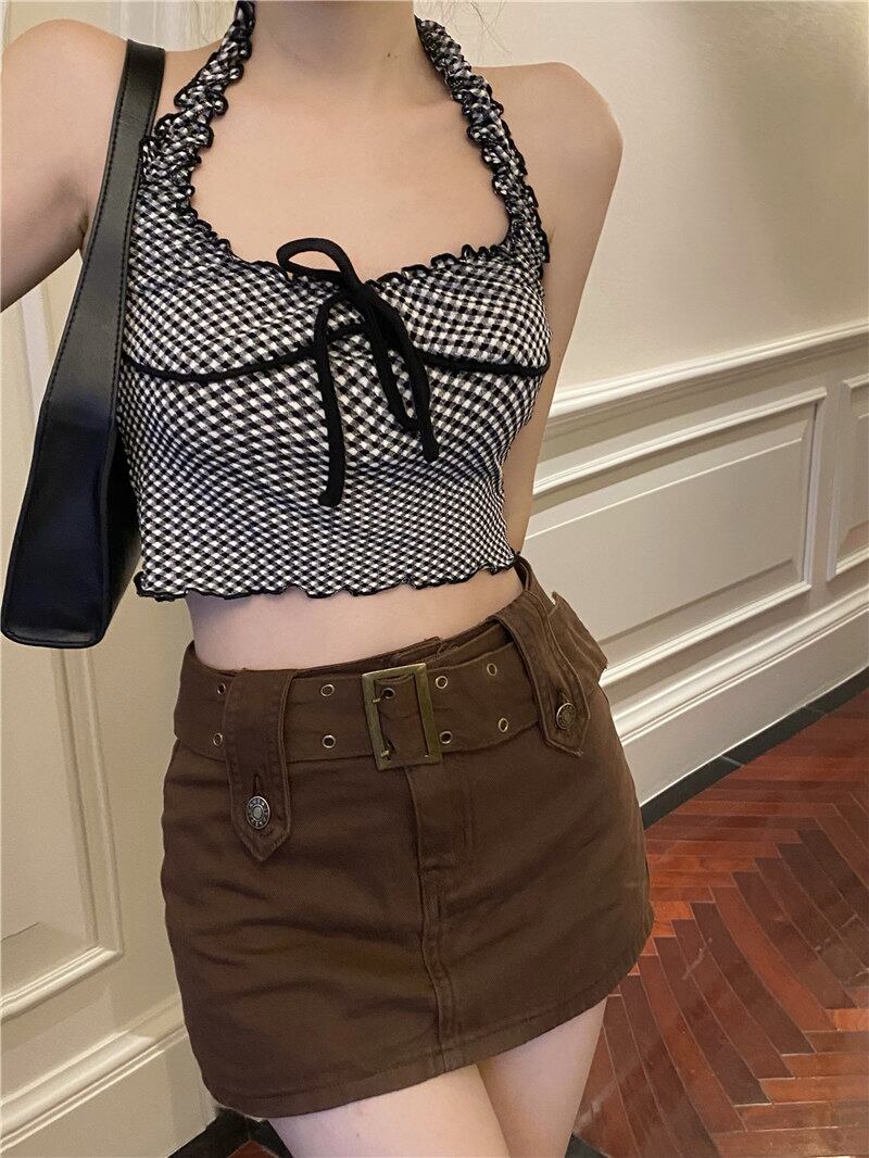 スウィートチェック柄ハンギングネックサスペンダーベスト女性夏菌エッジシックセクシーアウターウェアインナーボトミングトップ 大人ガーリー キュート カジュアル サマー 夏物 bstraw49945011996 | beaute25