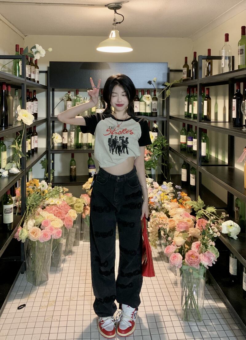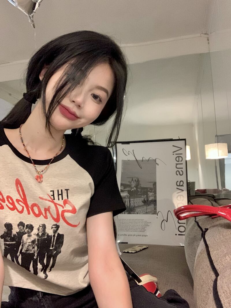 アメリカンスタイルのカラーブロッキング半袖プリントタイトTシャツ女性の夏の純粋な欲望レトロな小さな短い薄いトップ ショート サマー 夏物 ピュア bstraw30585970944 | beaute25
