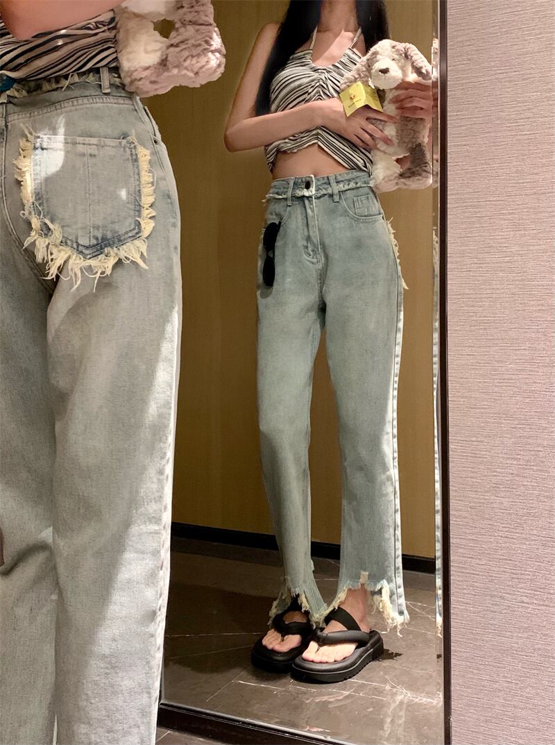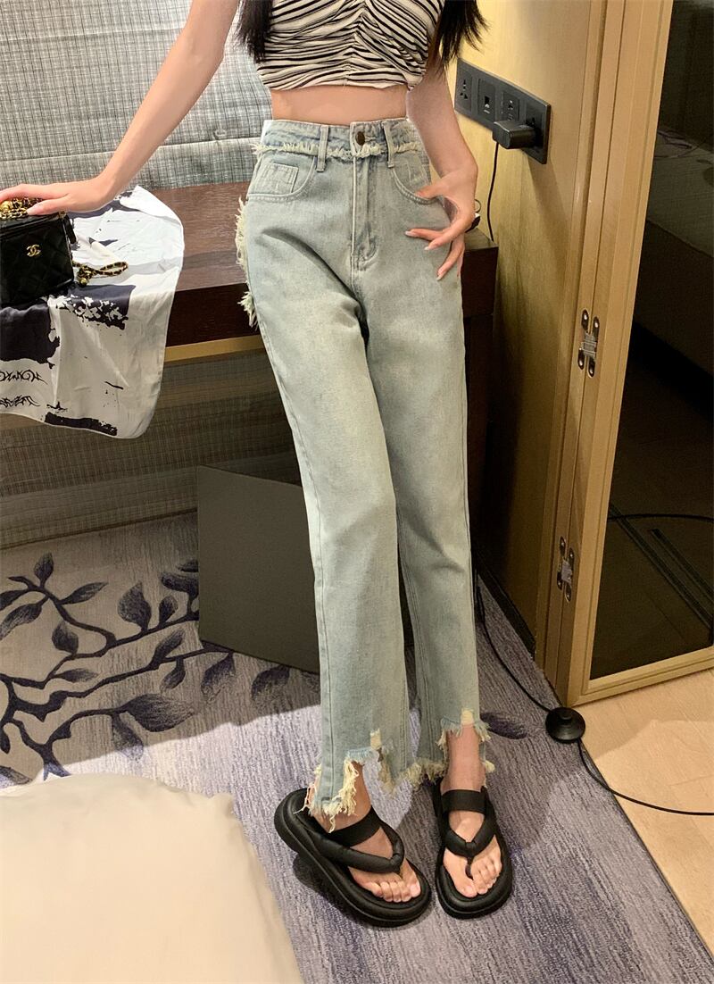 破れた穴生フリンジフリンジストレートジーンズレディース夏薄パンツルーズハイウエスト細幅レッグ9点パンツ ハイウェスト サマー 夏物 ワイドレッグ ワイドパンツ bstraw5945090872 | beaute25