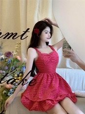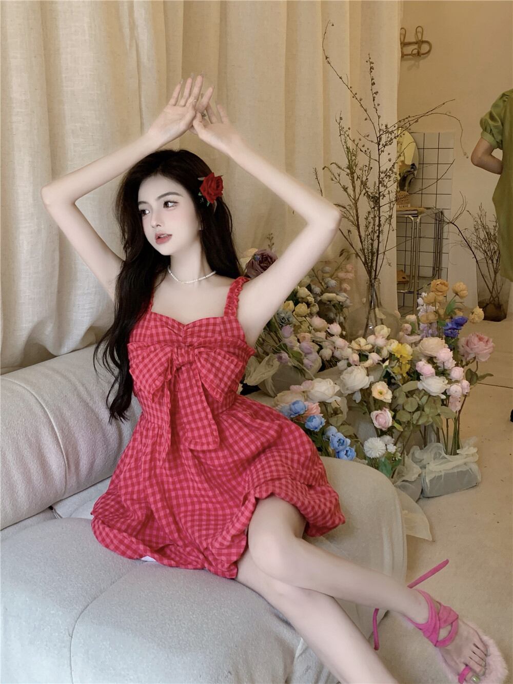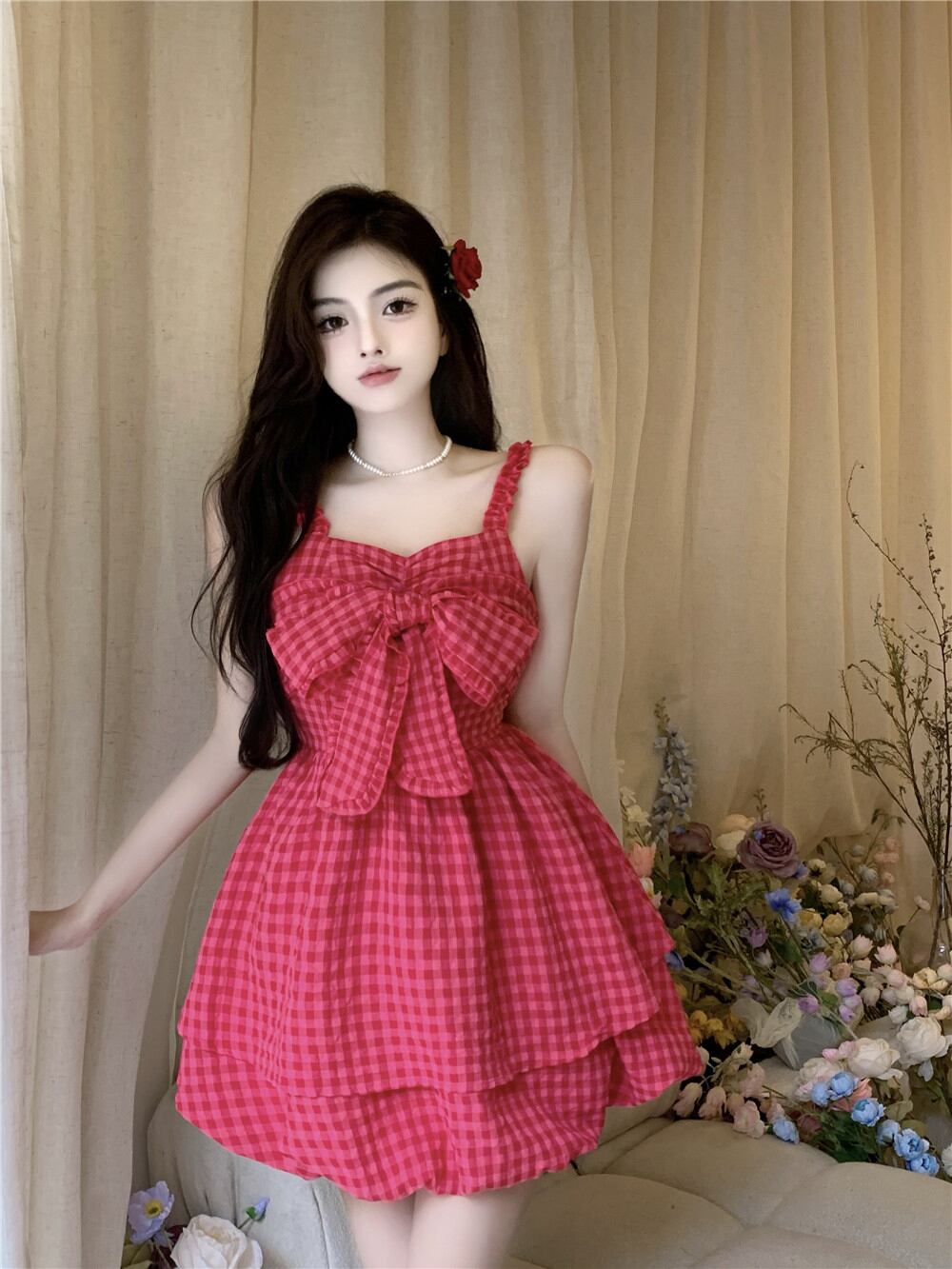 ラズベリーカラーのリボンサスペンダードレス女性の夏の甘い純粋な欲望セクシーなウエストケーキふわふわのショートスカート 大人ガーリー スウィート キュート カジュアル サマー 夏物 ピュア bstraw64697270355 | beaute25