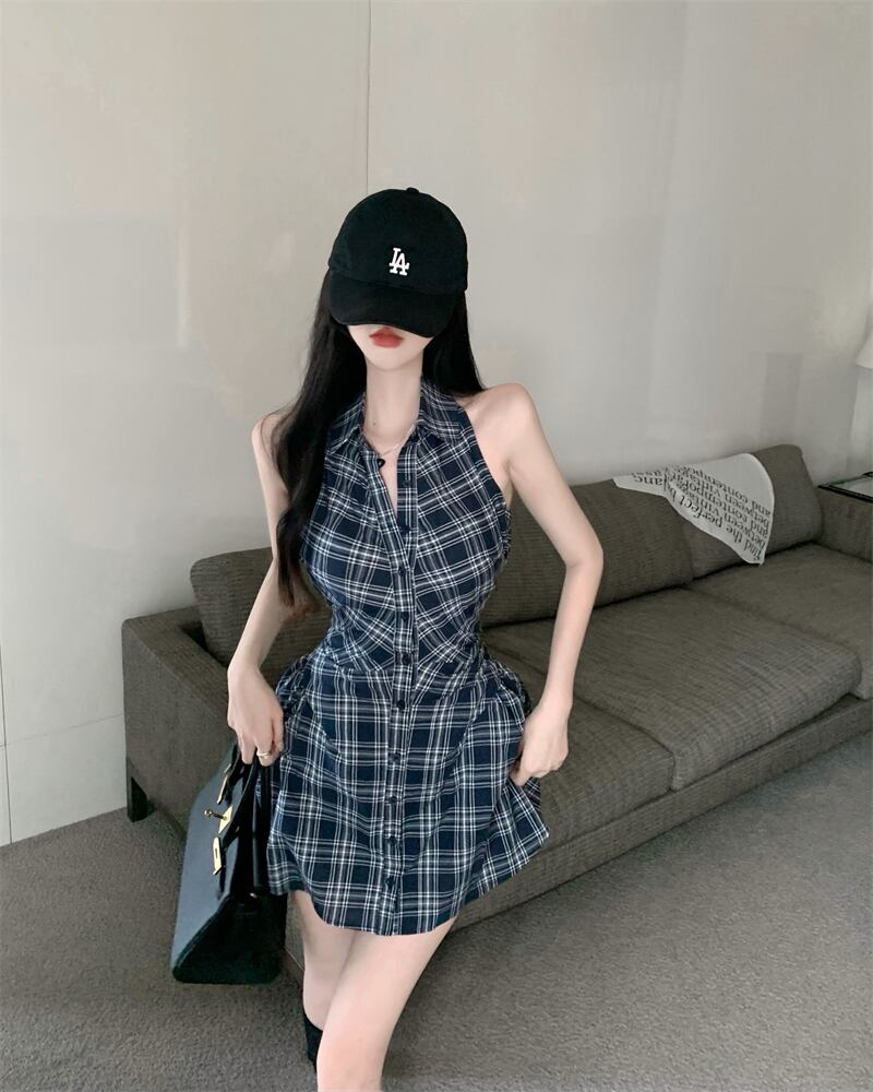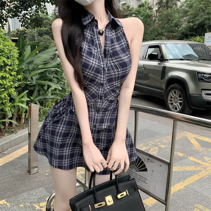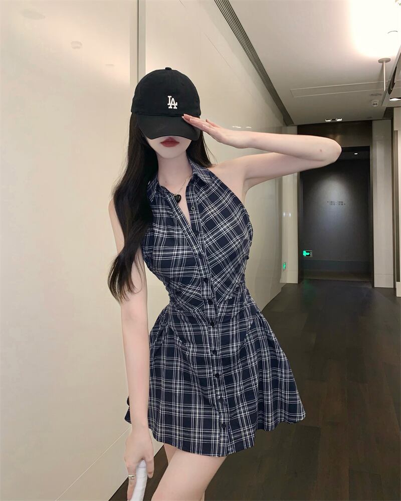 ホットチェック柄シャツホルタードレス女性の夏の純粋な欲望ノースリーブタイトセクシーウエストショートスカートツーピースセット サマー 夏物 ピュア bstraw5496527298 | beaute25