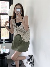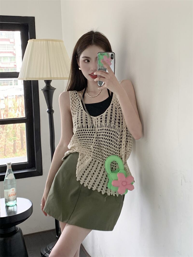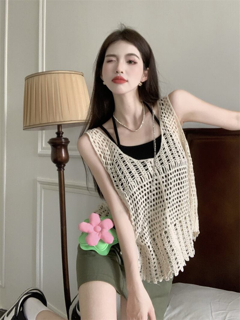 ニットキャミソールベストのバージョン女性の夏の中空甘くてクールなルーズノースリーブショートアウターウェアインナートップ 大人ガーリー スウィート キュート カジュアル サマー 夏物 bstraw11906631764 | beaute25