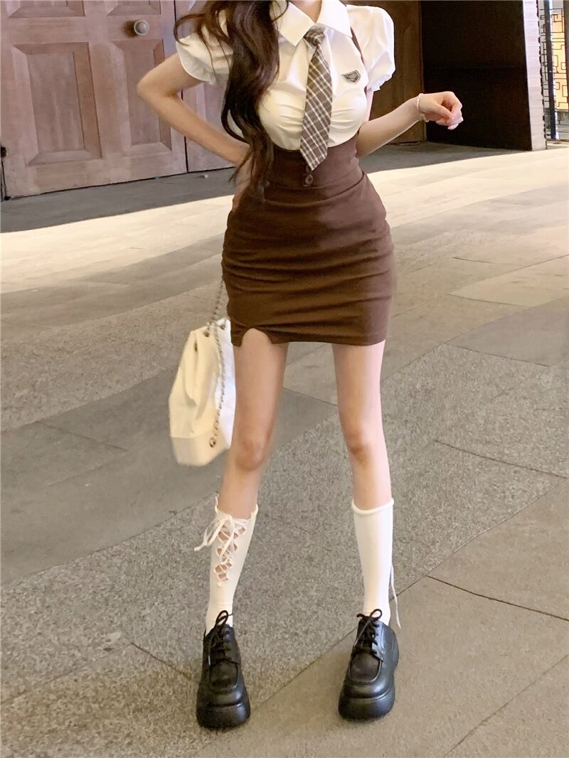 色:白いシャツ(ネクタイ付き),コーヒー色のドレス