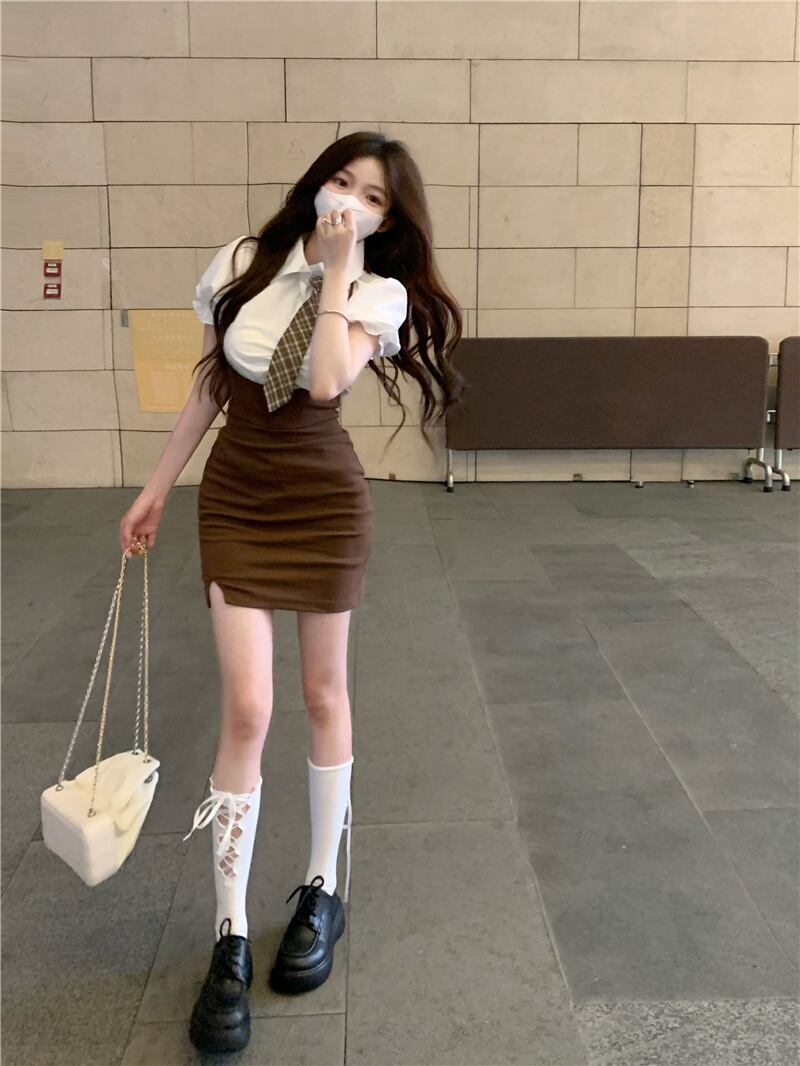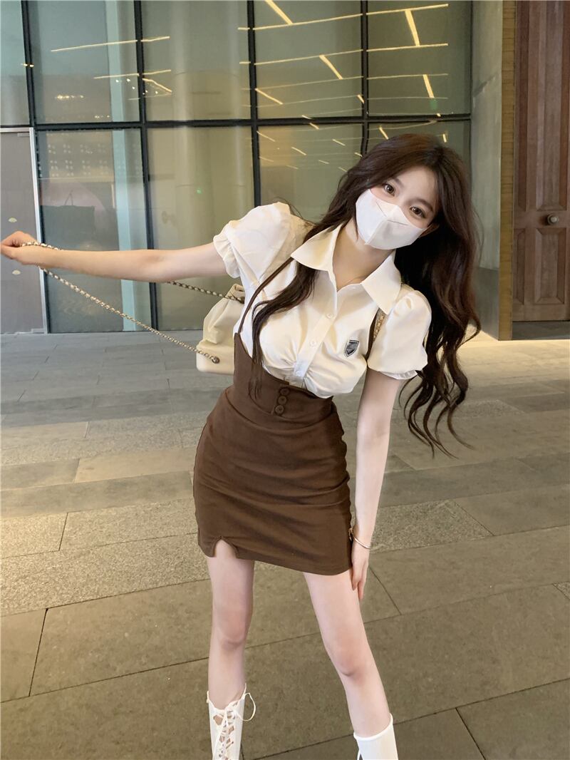 パフスリーブシャツレディース夏気質ファッションスーツカレッジスタイルスウィートセクシーサスペンダードレスツーピース 大人ガーリー キュート カジュアル サマー 夏物 bstraw60124243091 | beaute25