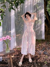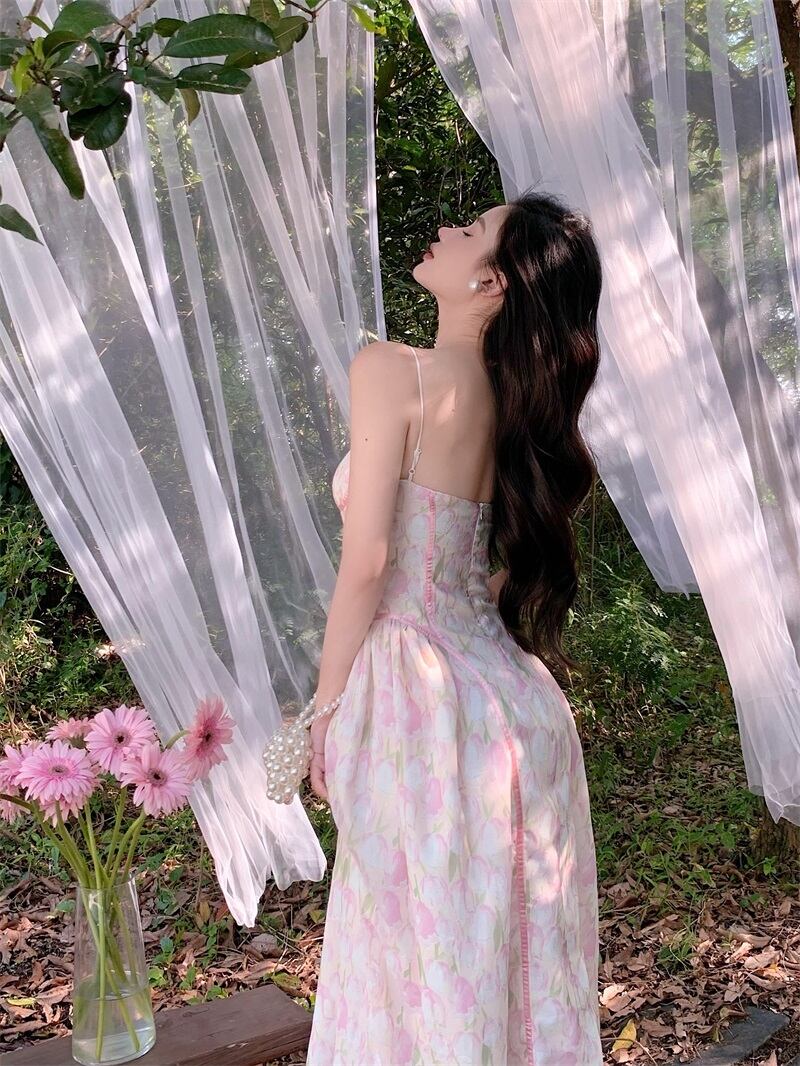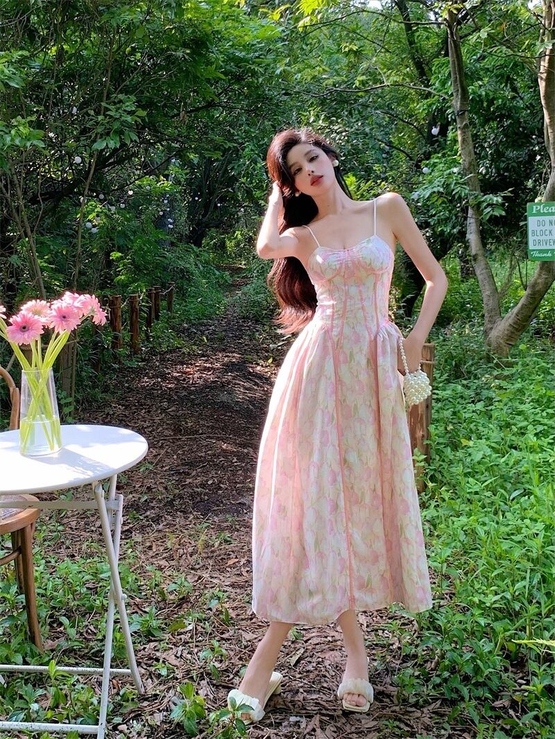 優しい風チューリップサスペンダードレス女性2022年夏の新しい甘い気質ウエストミドル丈スカート 大人ガーリー スウィート キュート カジュアル サマー 夏物 bstraw14827246068 | beaute25