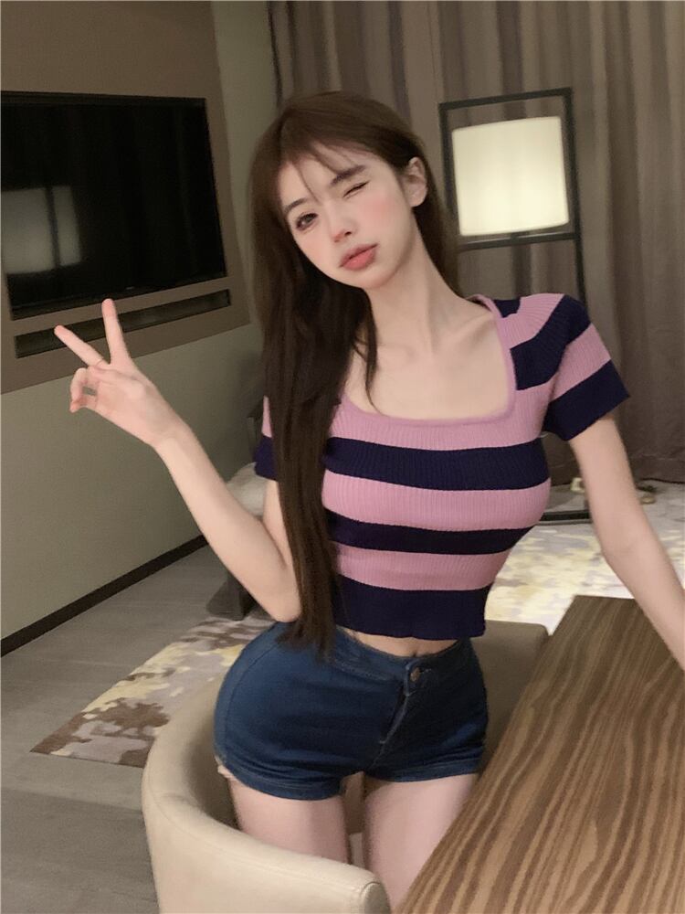 アイスシルクストライプ半袖ニットセーターレディースサマー薄手スウィートスクエアカラースリムスリムショートトップボトミングシャツ 大人ガーリー キュート カジュアル 夏物 スクウェア bstraw65416002783 | beaute25