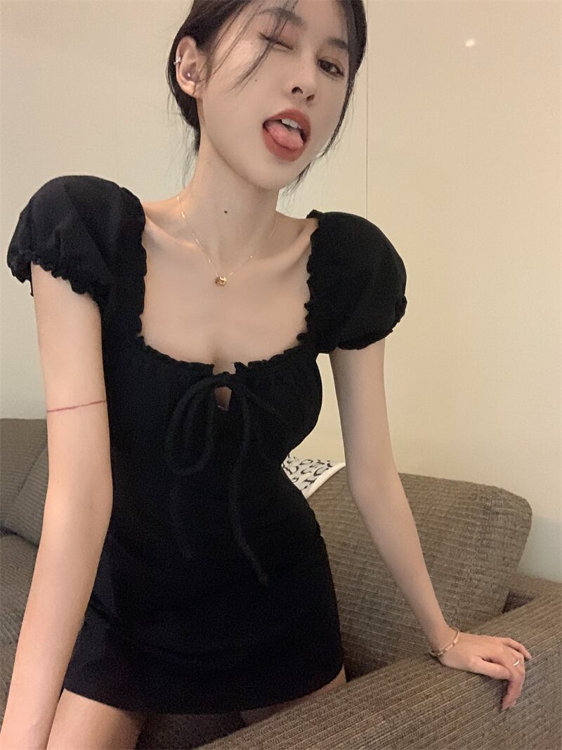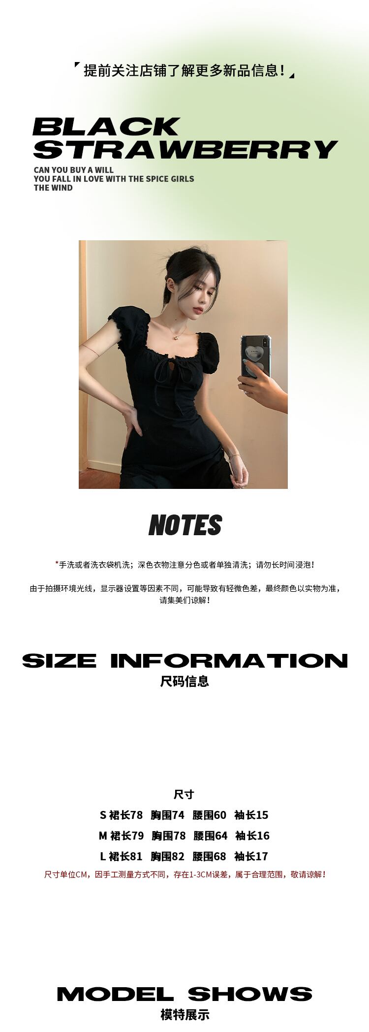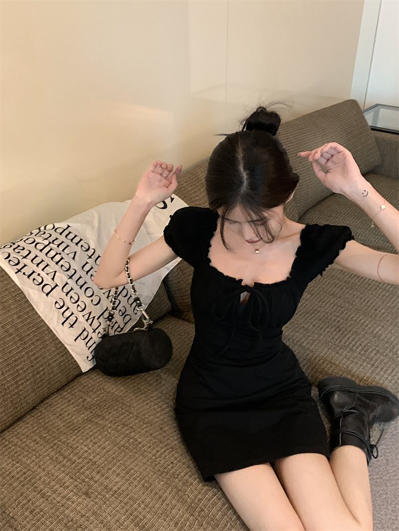 フレンチスクエアネック半袖ドレス女性の夏のリトルブラックドレス、真菌エッジ気質ウエストとスリムバッグヒップショートスカート サマー 夏物 スクウェア bstraw34393094277 | beaute25
