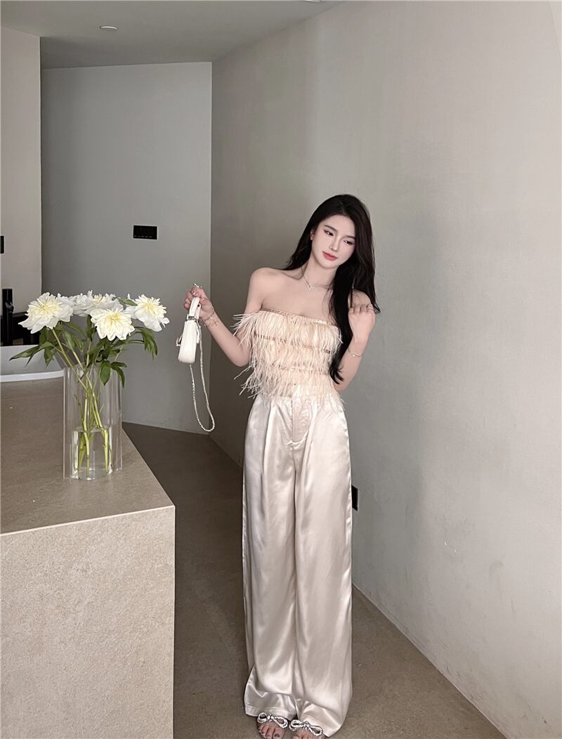サテンハイウエストスリムストレートカジュアルパンツレディースサマー薄身ドレープローズクールワイドレッグパンツパンツトレンディ ハイウェスト 夏物 ワイドパンツ bstraw10060244592 | beaute25