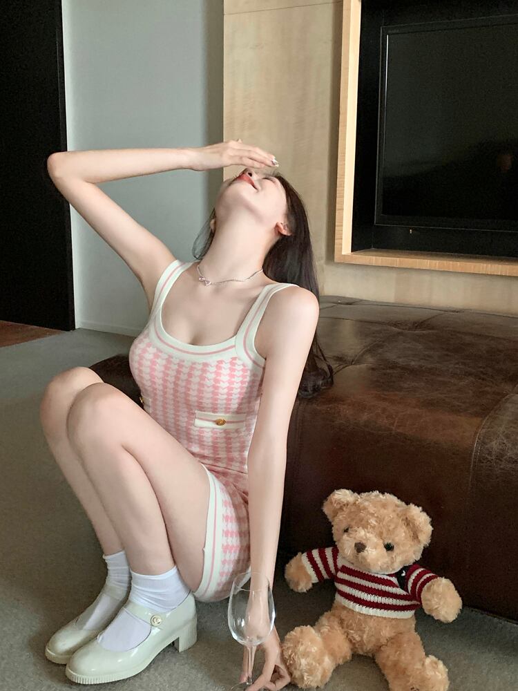 千鳥格子ニットサスペンダードレスレディースサマーピンクセクシースウィート気性ウエストバッグヒップショートスカート 大人ガーリー キュート カジュアル 夏物 bstraw38080713368 | beaute25