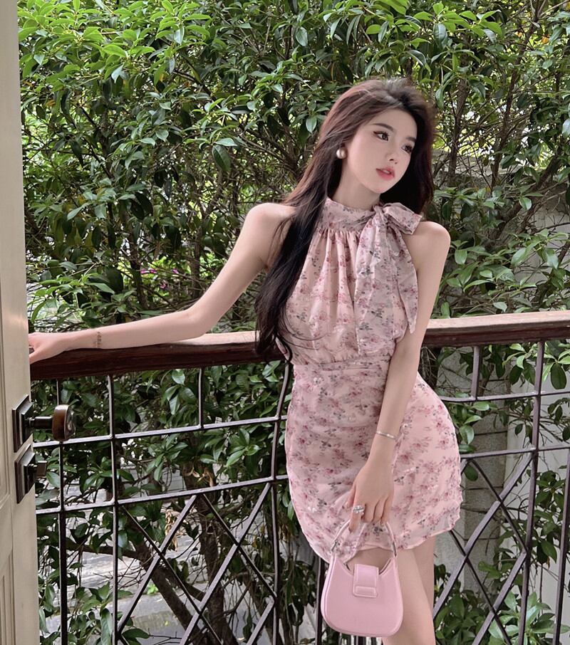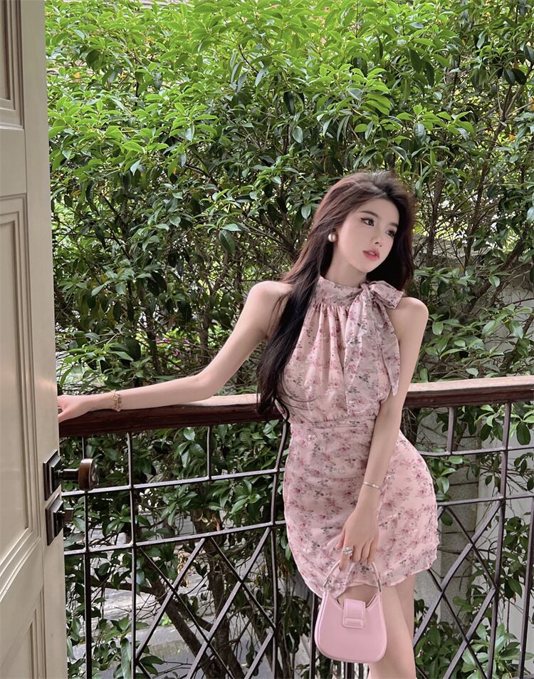 ストリーマーノースリーブハンギングネックドレスレディースサマーフレンチジェントルフローラルフローラルウエストショーシンバッグヒップテンペラメントショートスカート 夏物 花柄 bstraw99744496148 | beaute25