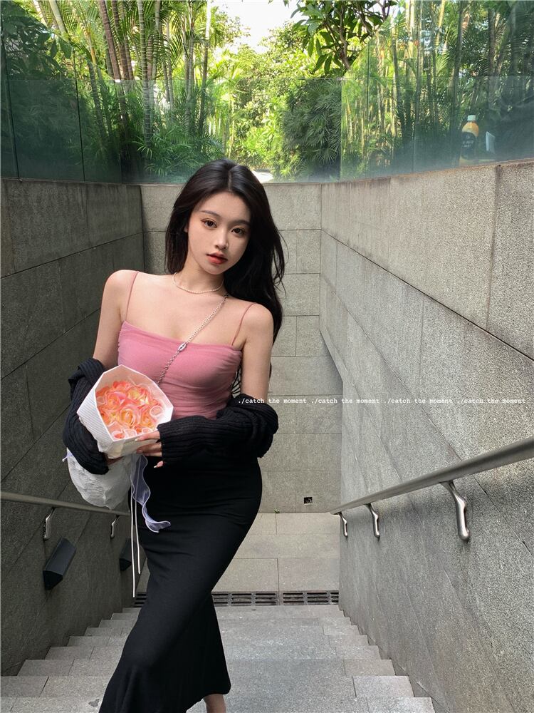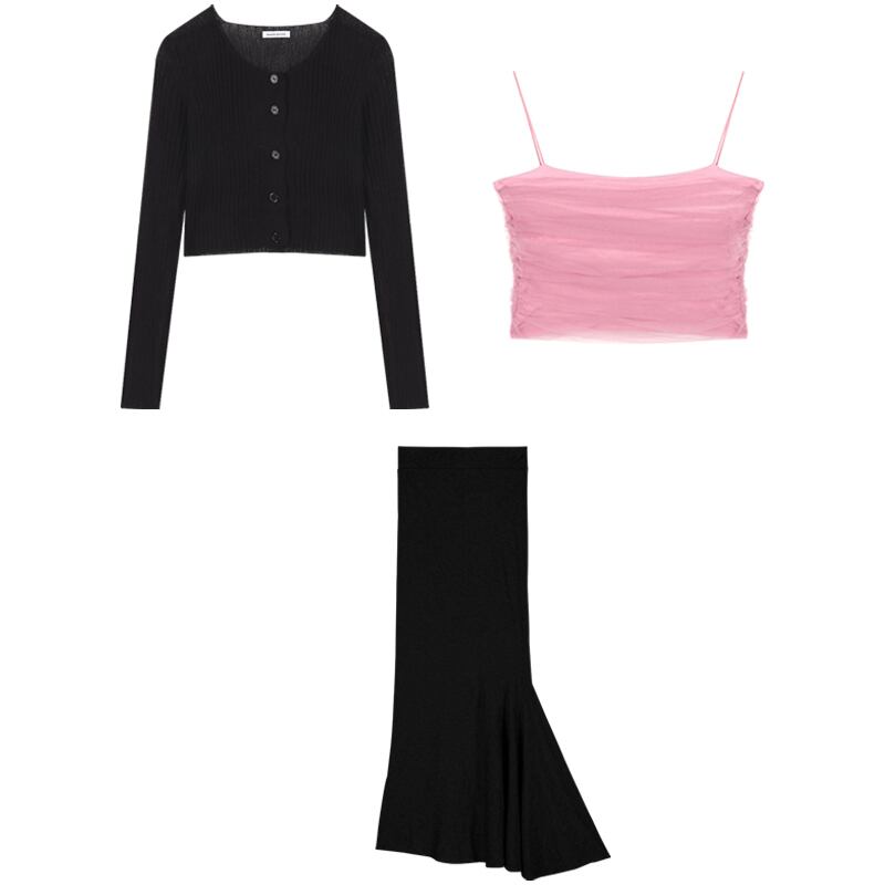色:ブラックニットカーディガン,緑のシャツ,グリーンベスト,ピンクのベスト,グレースカート,黒スカート