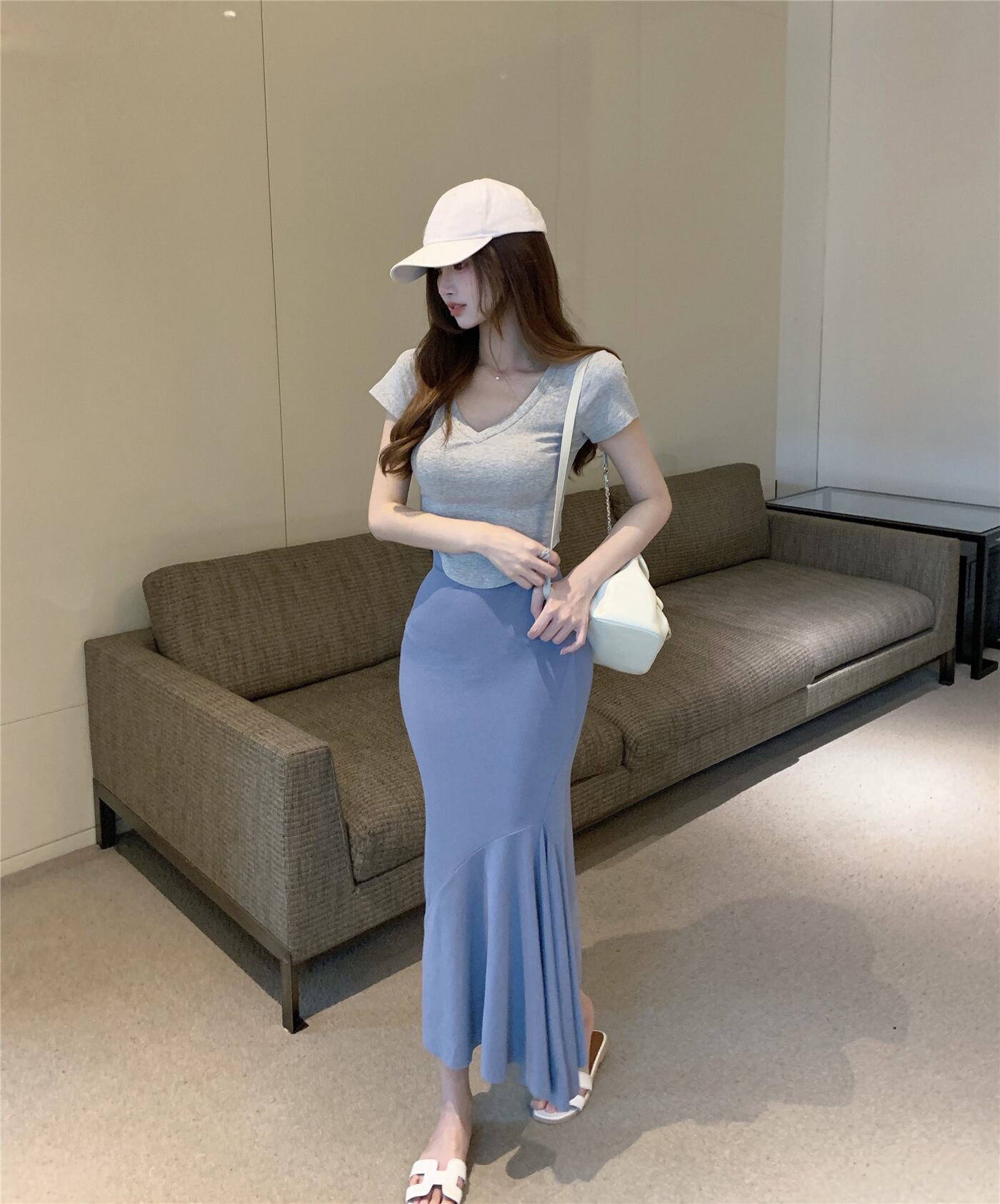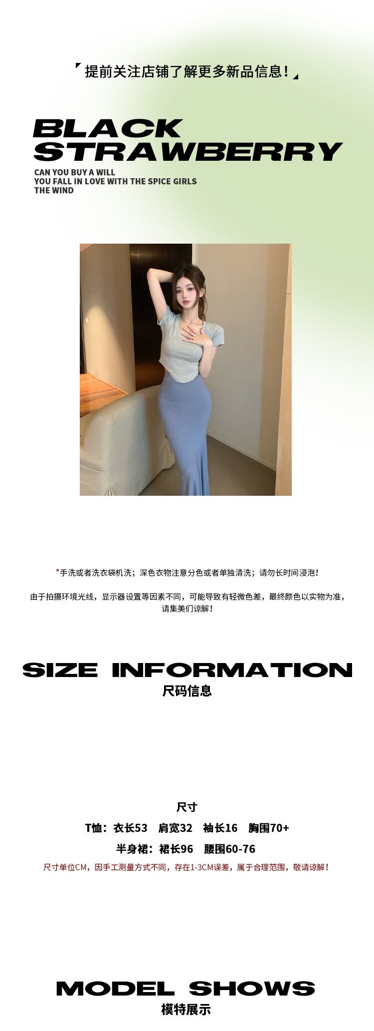 色:グレーの半袖,黒い半袖,青いスカート,グレースカート
