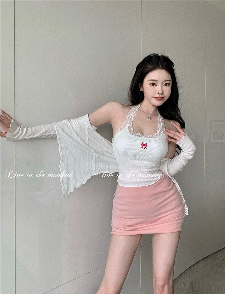 色:白いベスト,ピンクのスカート,白いカーディガン
