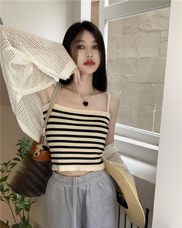 ストライプニットキャミソールベストレディースサマーレトロスウィートスリムフィットと薄手のアウターウェアショートトップ 大人ガーリー キュート カジュアル 夏物 bstraw74001788551 | beaute25