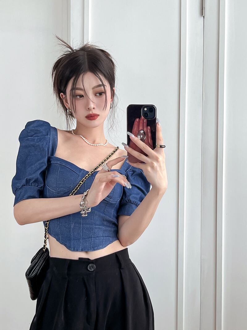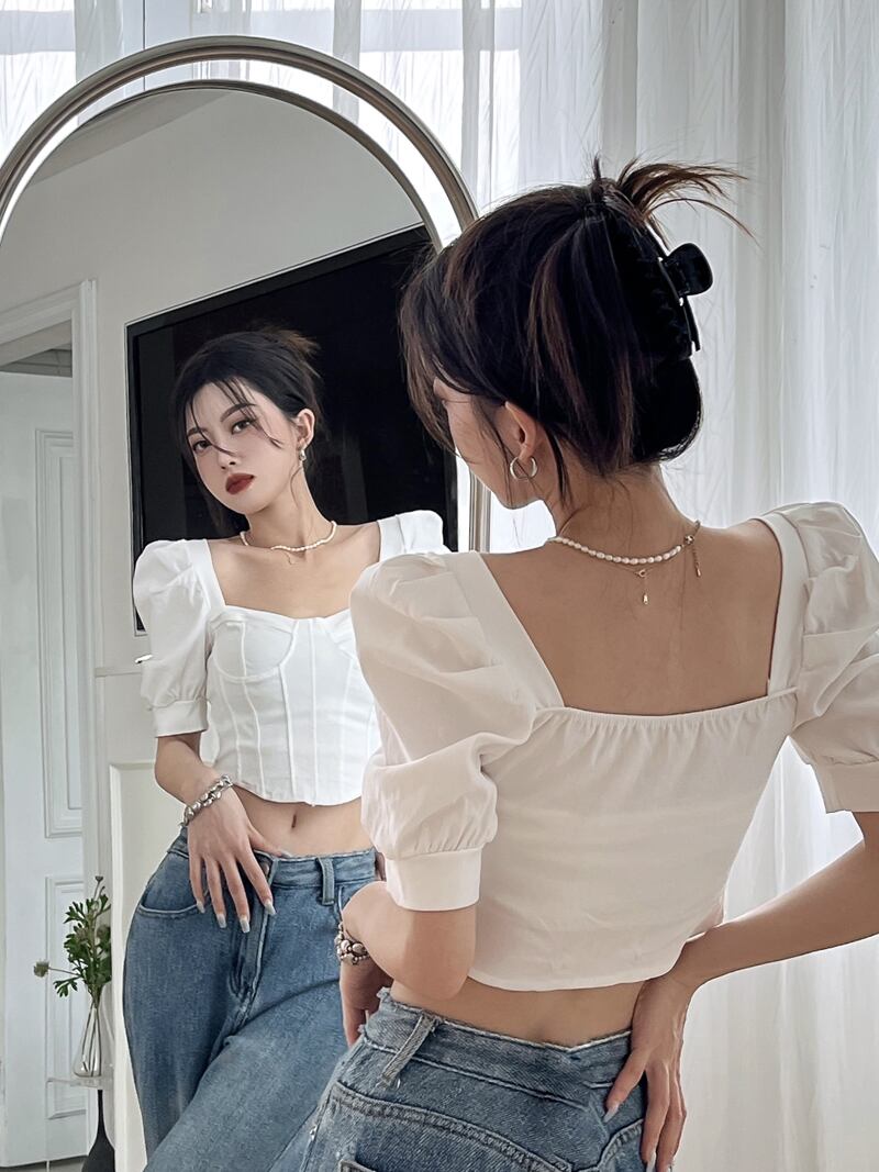 フレンチホワイトフィッシュボーンスクエアカラー半袖シャツレディースサマーピュアデザイアへそスリムスリムショートセクシートップ ハーフスリーブ 夏物 スクウェア bstraw33945122253 | beaute25