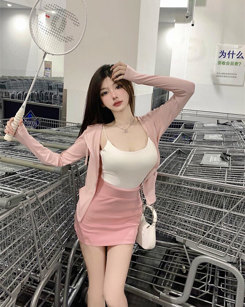 色:ブルーカーディガン,ピンクのカーディガン,ネイビーショートスカート,ピンクのスカート,白いインナーストラップ