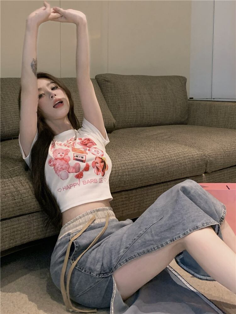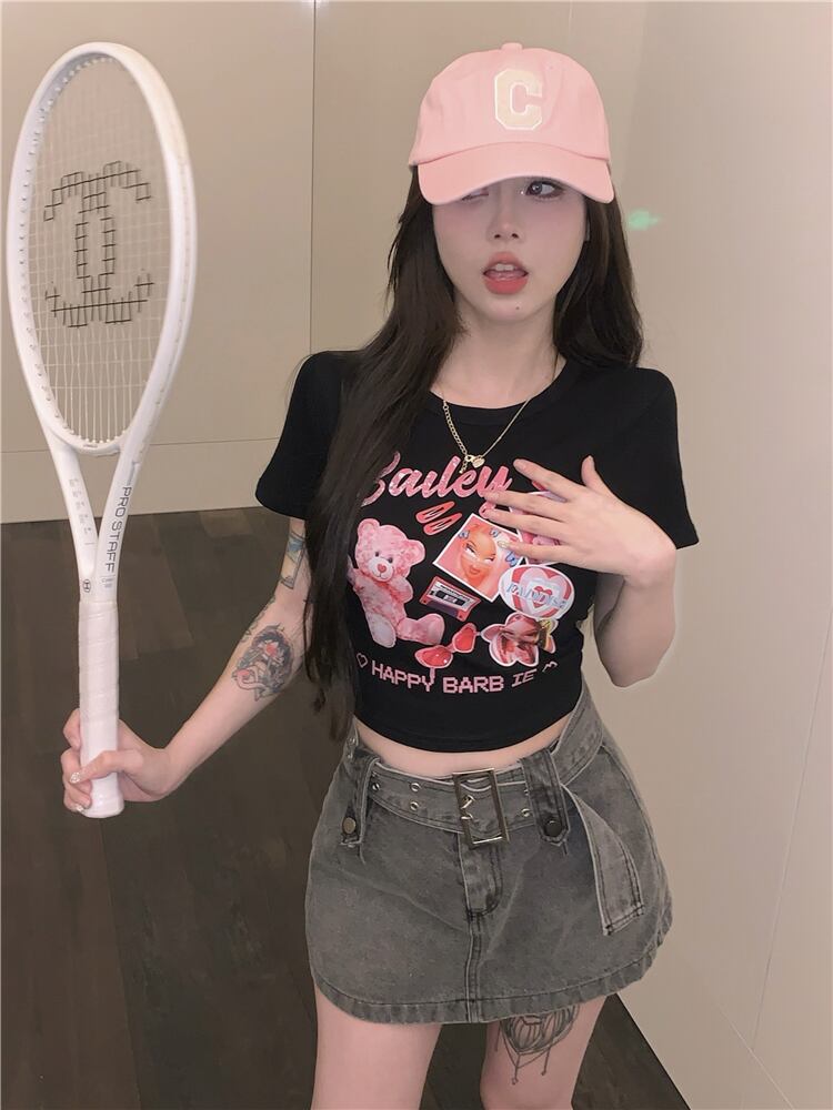 黒の甘いTシャツ女性の潮の夏の漫画の印刷セクシーな肩の短いセクションタイトで薄い半袖トップ ショート ブラック 大人ガーリー スウィート キュート カジュアル サマー 夏物 bstraw95721184303 | beaute25