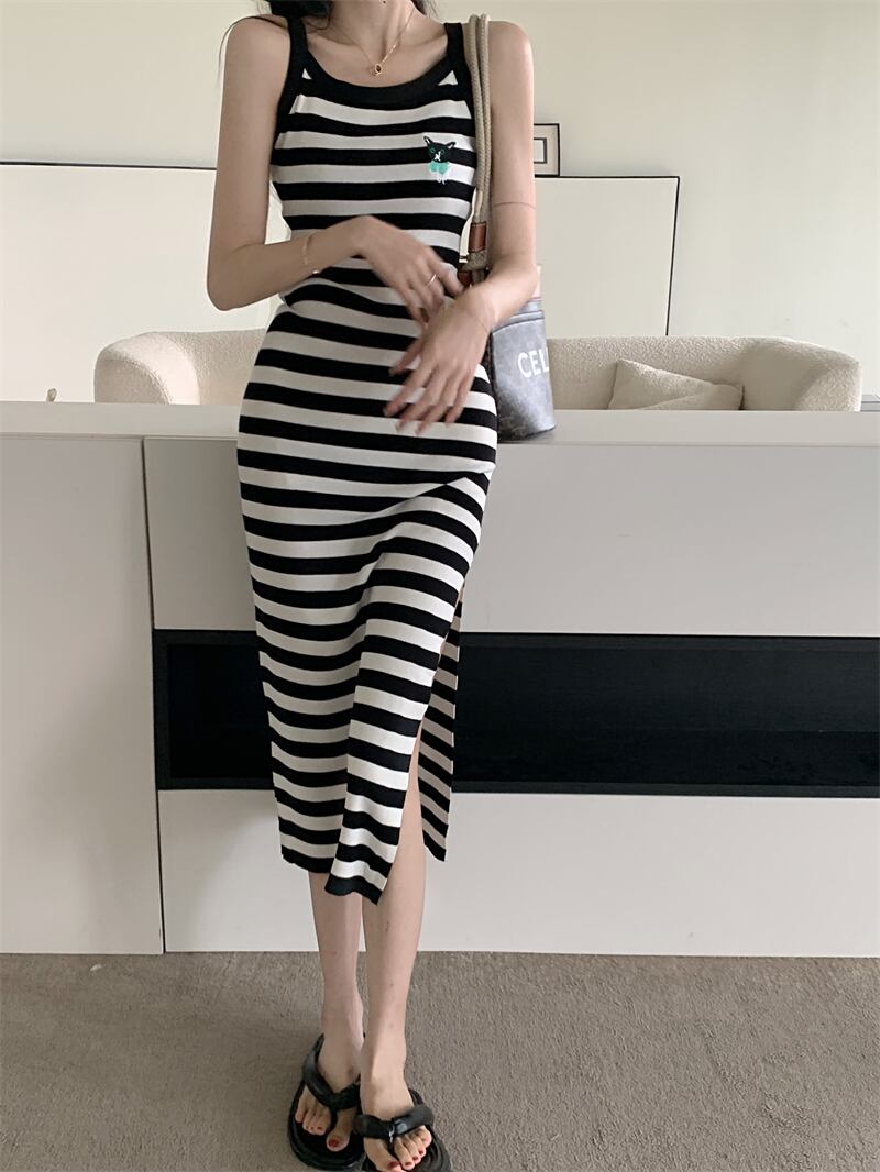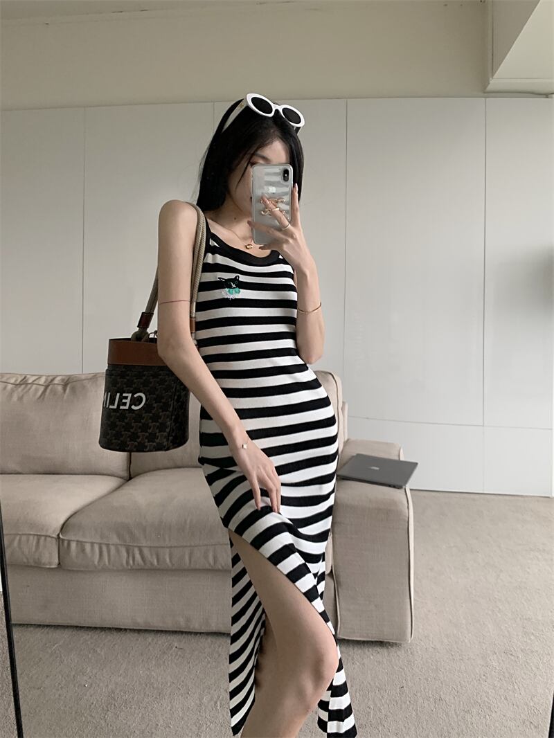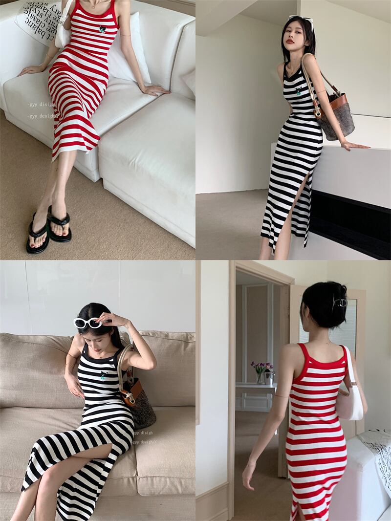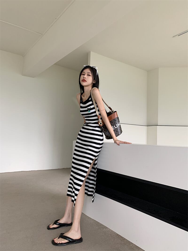 ピュアデザイアスタイルストライプセクシーサスペンダーワンピースレディースサマースウィートウエストスリムスリットミドル丈スカート 大人ガーリー キュート カジュアル 夏物 bstraw41255041886 | beaute25