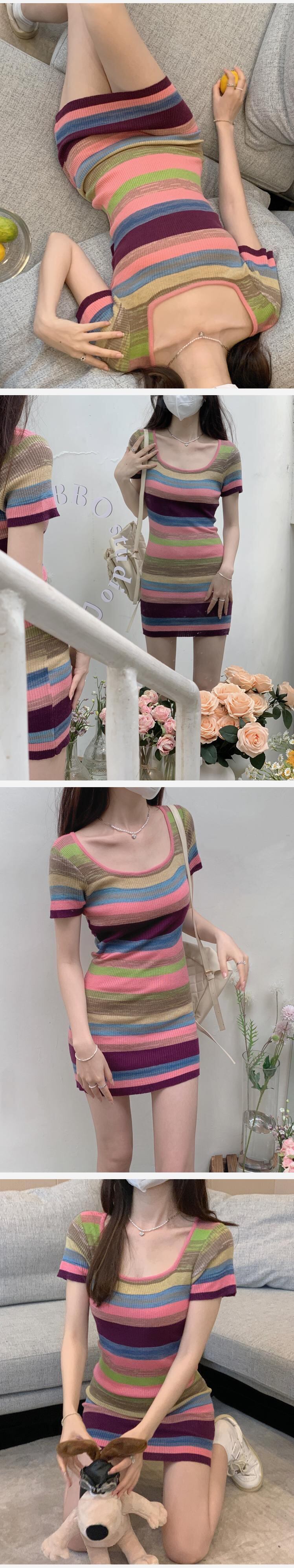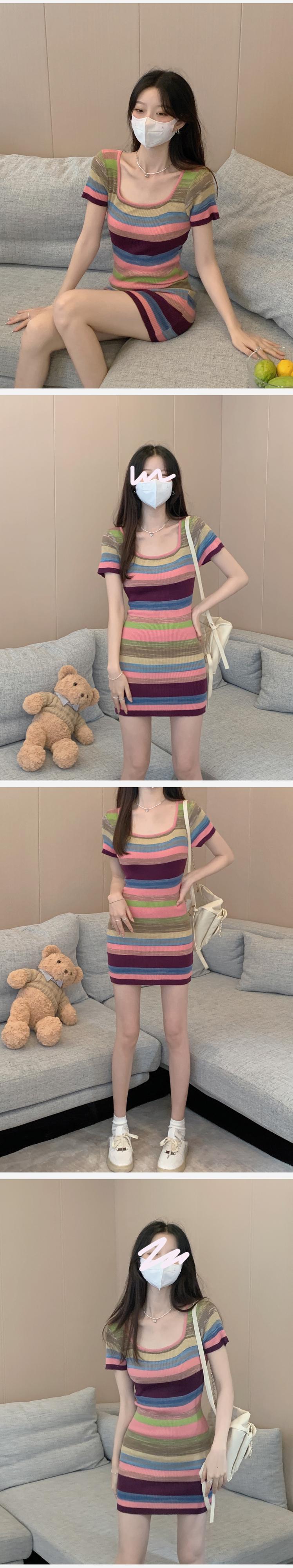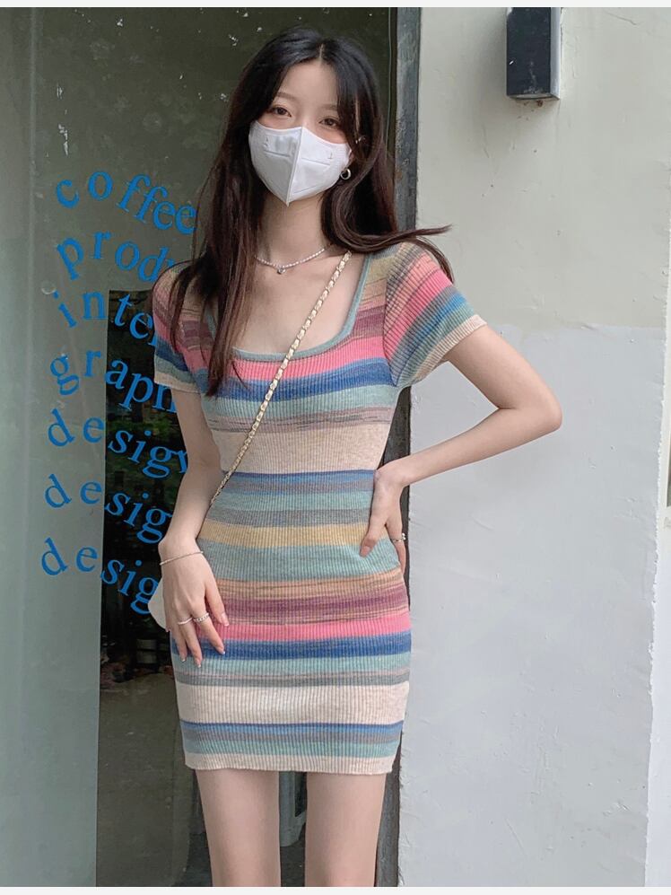 カラフルなストライプの半袖ドレスレディースサマースウィートスクエアネックニットセクシースリムスリミングバッグヒップショートスカート 大人ガーリー キュート カジュアル 夏物 スクウェア bstraw66909954960 | beaute25