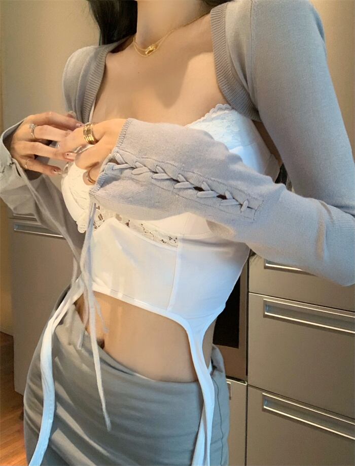 色:グレーパンツ,ホワイトサスペンダー,グレーのカーディガン