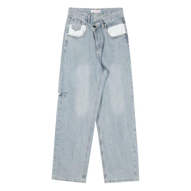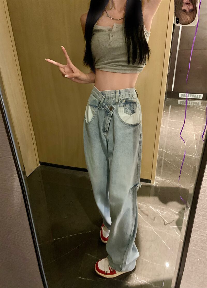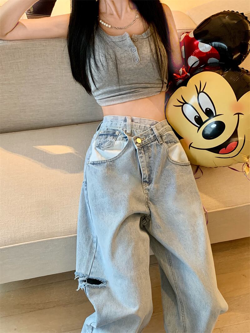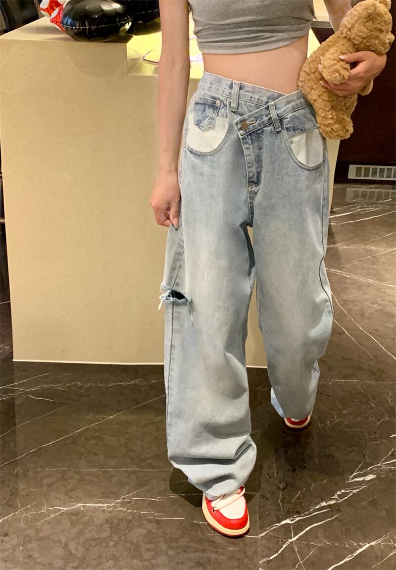 破れたストレートジーンズの女性の2022年夏の新しいルーズウォッシュドドレープハイウエストシンワイドレッグパンツパンツ ハイウェスト サマー 夏物 ワイドパンツ bstraw62794765975 | beaute25