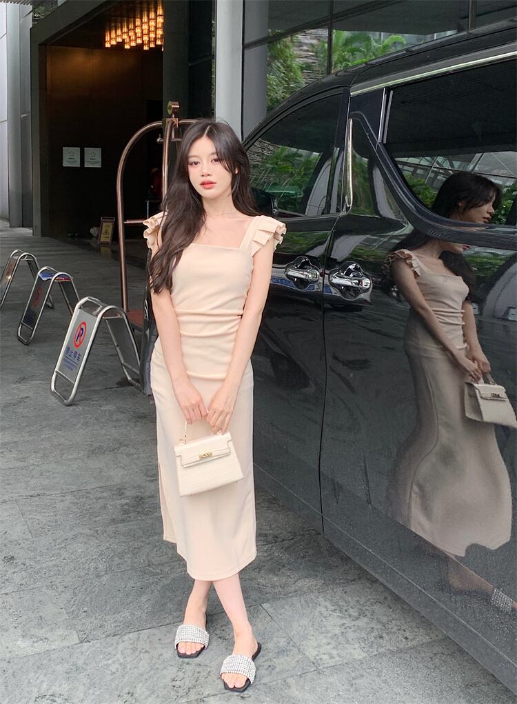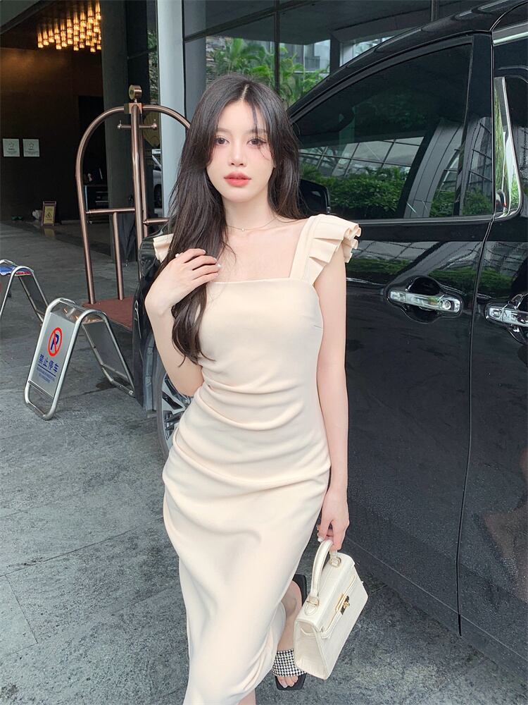 黒の小さなフライングスリーブサスペンダードレス女性の夏フランスの気質スリットセクシーな背中の開いたミドル丈ヒップスカート ブラック サマー 夏物 bstraw43098503500 | beaute25