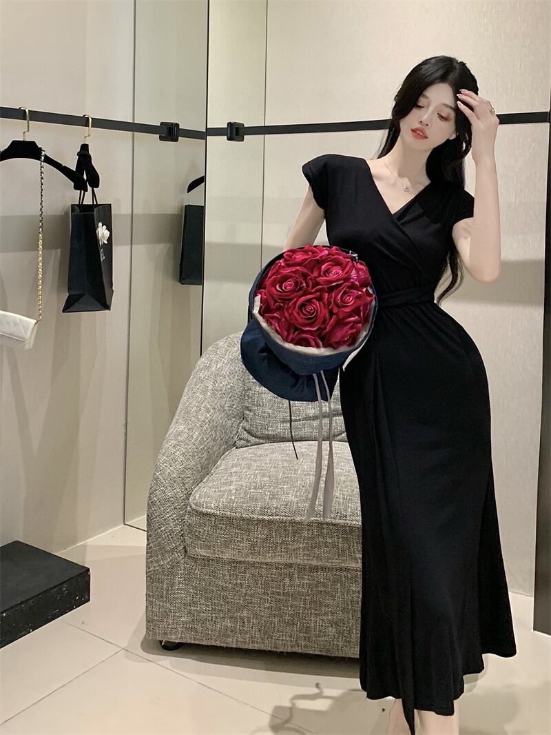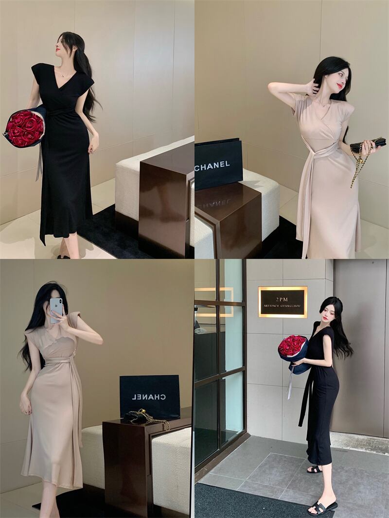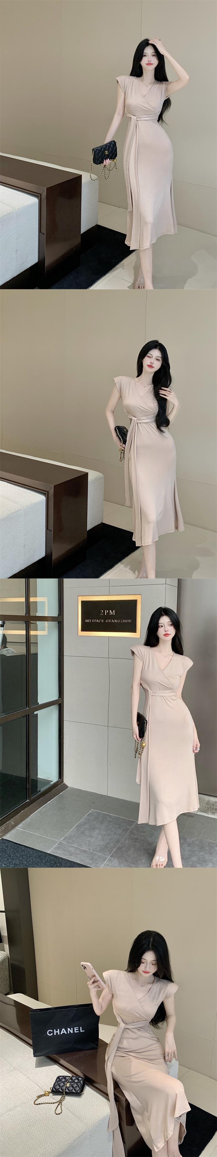 アプリコットVネックノースリーブショルダーパッドドレスレディースサマーハイエンドスリムフィットで年齢を減らすレースアップミドル丈フィッシュテールスカート 夏物 bstraw65646654275 | beaute25