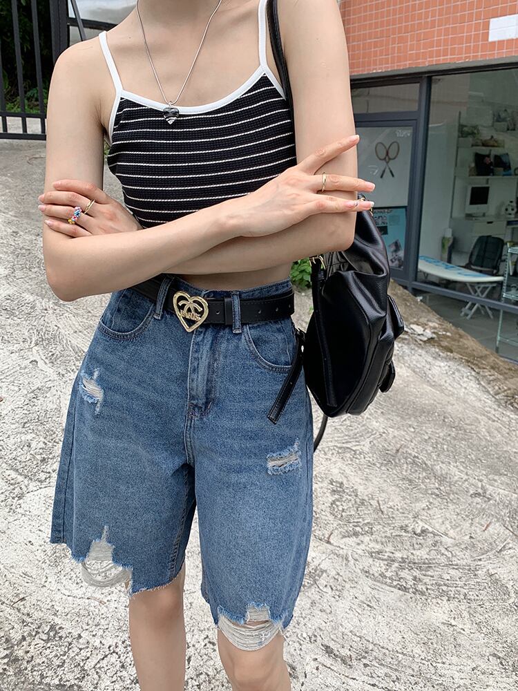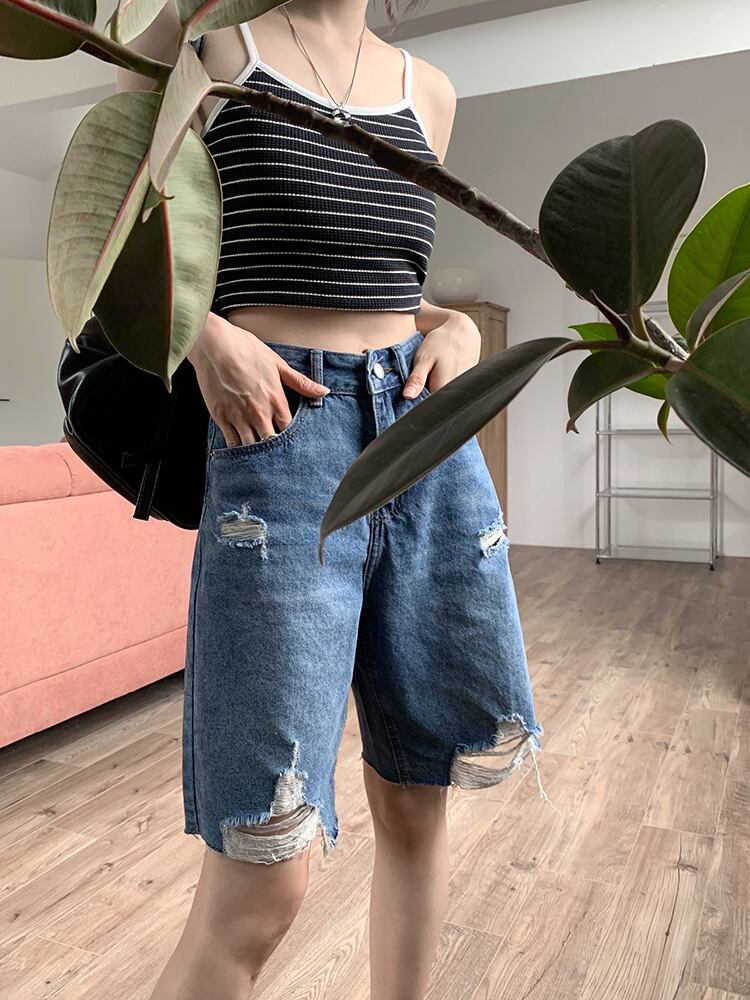 ブルーリッピングストレートデニムショーツレディースサマールーズ5点ミッドパンツハイウエストスモールラフエッジワイドレッグパンツ 夏物 ブルマー bstraw91740015029 | beaute25