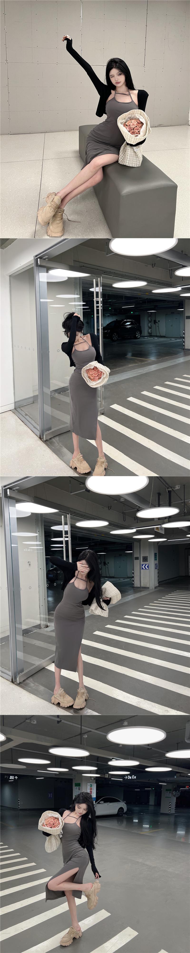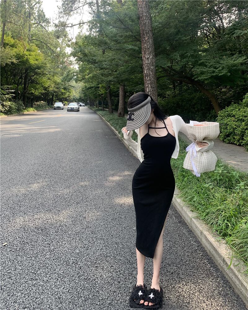 黒のスプリットサスペンダードレス女性の夏の純粋な欲望ハイエンドホルターネックオープンバックミドル丈ヒップスカート ブラック サマー 夏物 ピュア bstraw11153298900 | beaute25