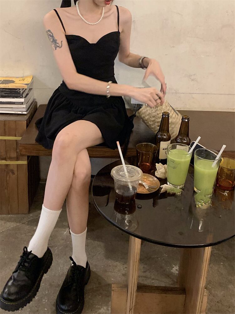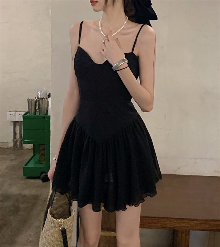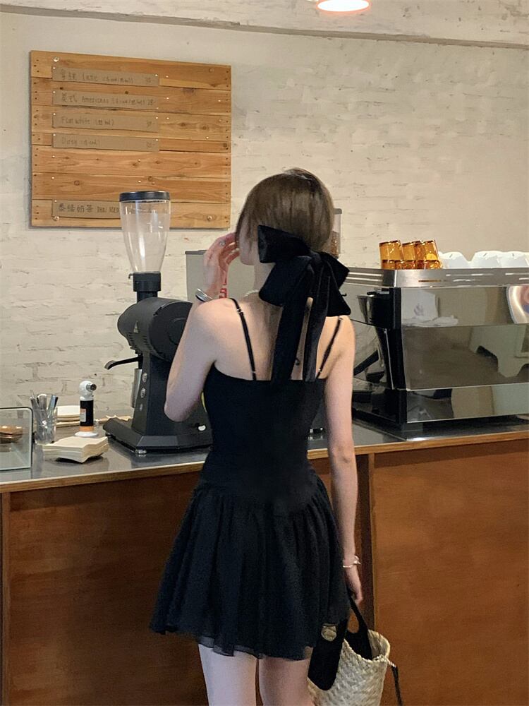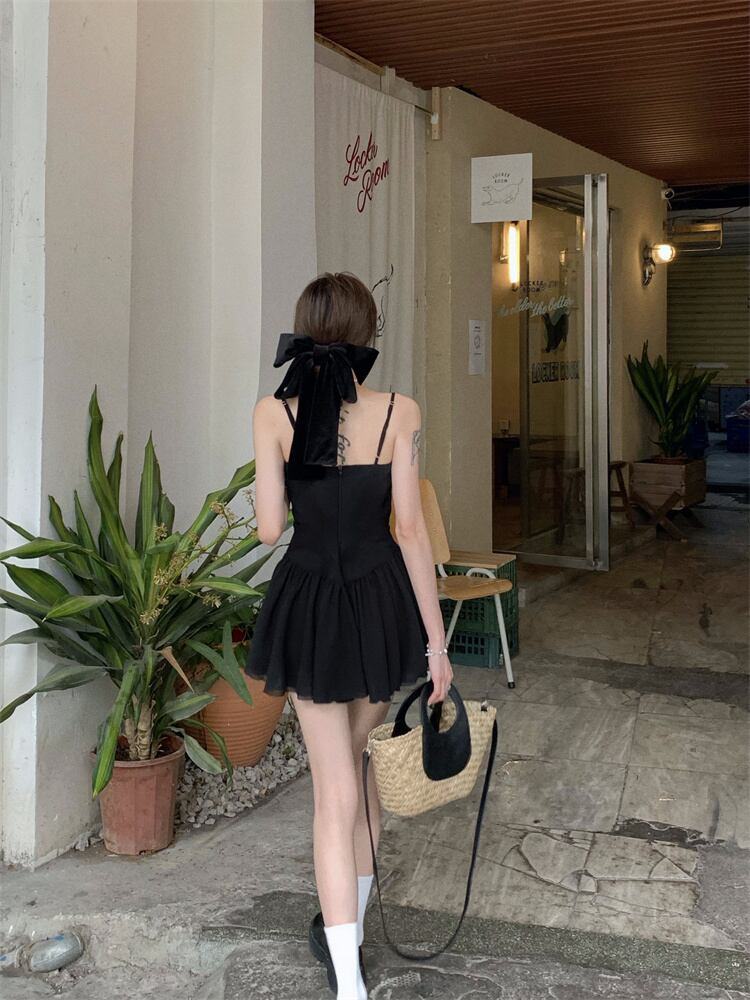 黒のVネックサスペンダードレス女性の夏の小さな黒のドレス背中の開いたノースリーブの小さな男海辺の休暇aラインショートスカート ブラック サマー 夏物 bstraw43462700913 | beaute25