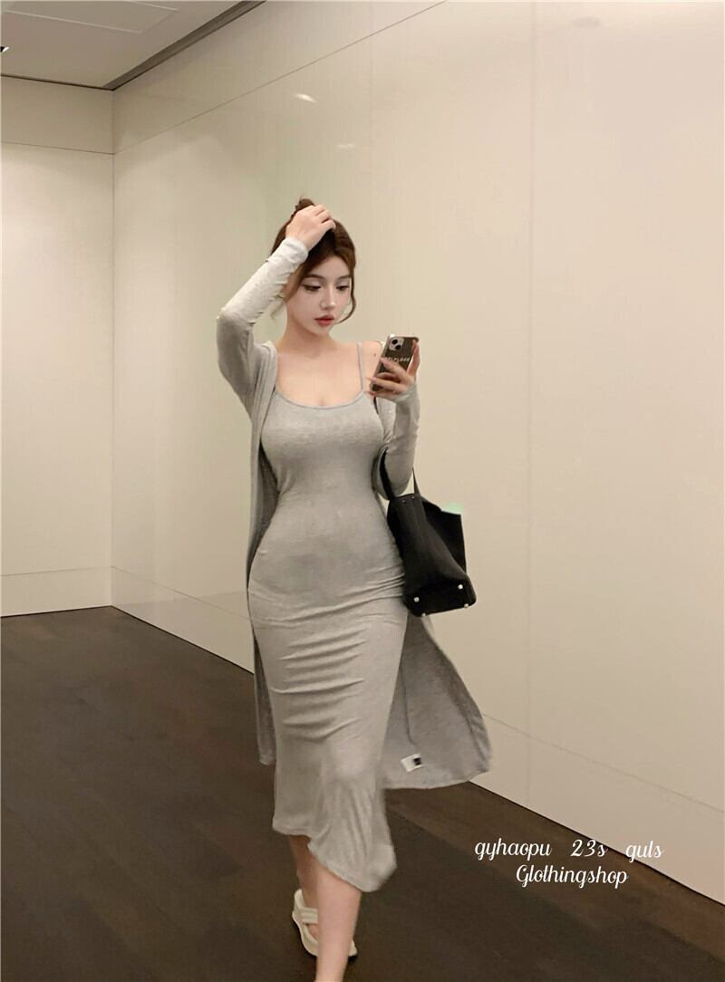 色:グレーのカーディガンジャケット,ブラックカーディガンジャケット,黒のサスペンダードレス,グレーのサスペンダードレス