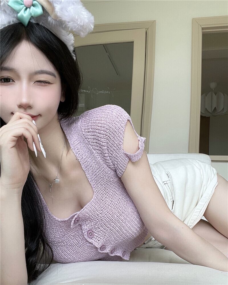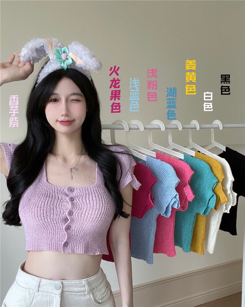 スウィートスパイスガールスクエアネック半袖ニットスモールカーディガンレディースサマーパープルスモールスリムショートボトムトップ ハーフスリーブ 大人ガーリー キュート カジュアル 夏物 スクウェア bstraw72262650957 | beaute25