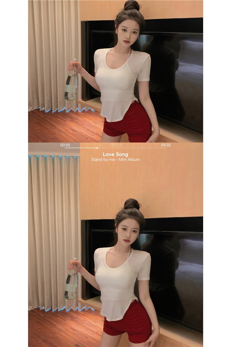 色:キャミソール,白いTシャツ,赤いショートパンツ