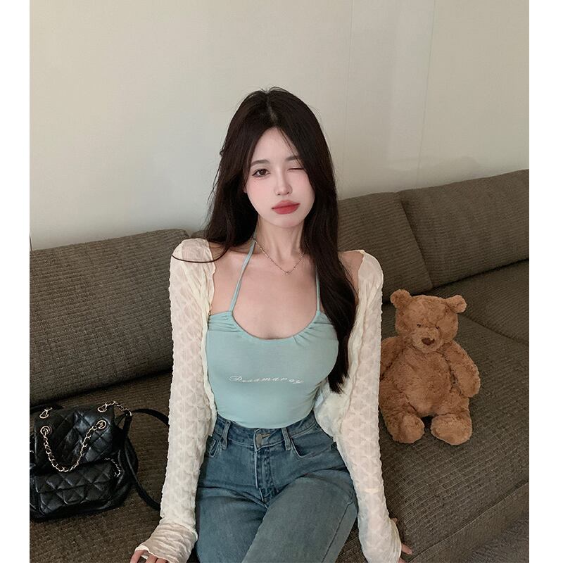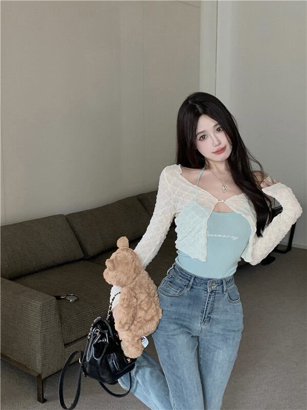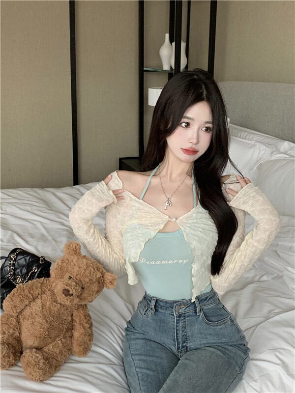 色:ライトブルーのサスペンダー,ベージュカーディガン