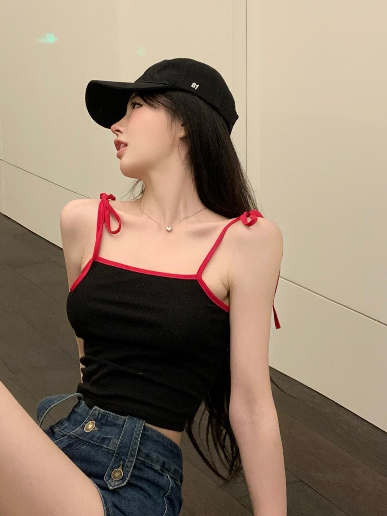 甘い女の子がキャミソールベストの女性のイントレンディな夏のスリムフィットと薄いアウターウェアのインナーボトミングシャツトップをひもで締めます レース 大人ガーリー スウィート キュート カジュアル サマー 夏物 レースアップ bstraw55464206071 | beaute25