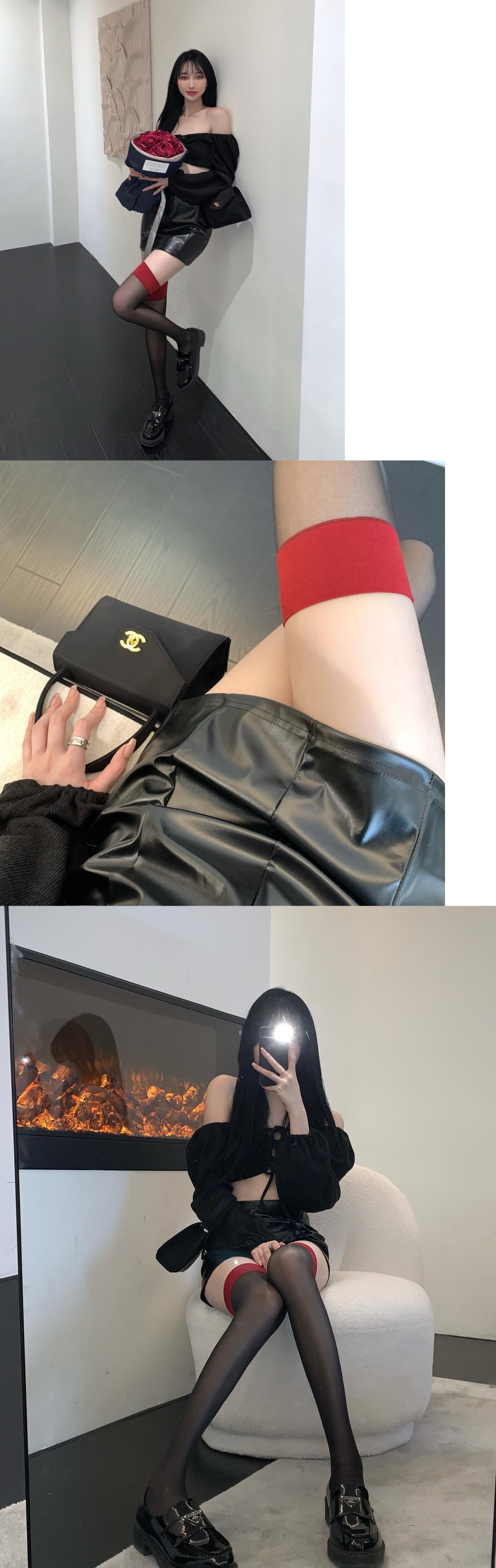 色:赤いエッジの膝上ブラックソックス,膝上ブラック,パンスト黒