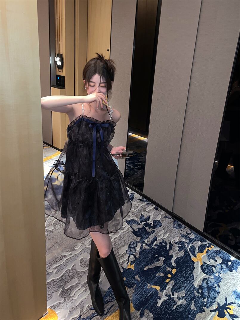 オーガンザ サスペンダー ドレス女性の夏のハイエンド ボウ ウエスト気質ふわふわ a ライン ショート スカート リボン サマー 夏物 Aライン bstraw18858873129 | beaute25
