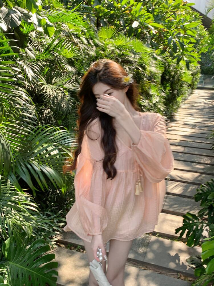パフスリーブシャツレディースサマーデザインセンスニッチVネックシャツフレンチスウィートゆったり気質ミドル丈トップス 大人ガーリー キュート カジュアル 夏物 bstraw81170195276 | beaute25