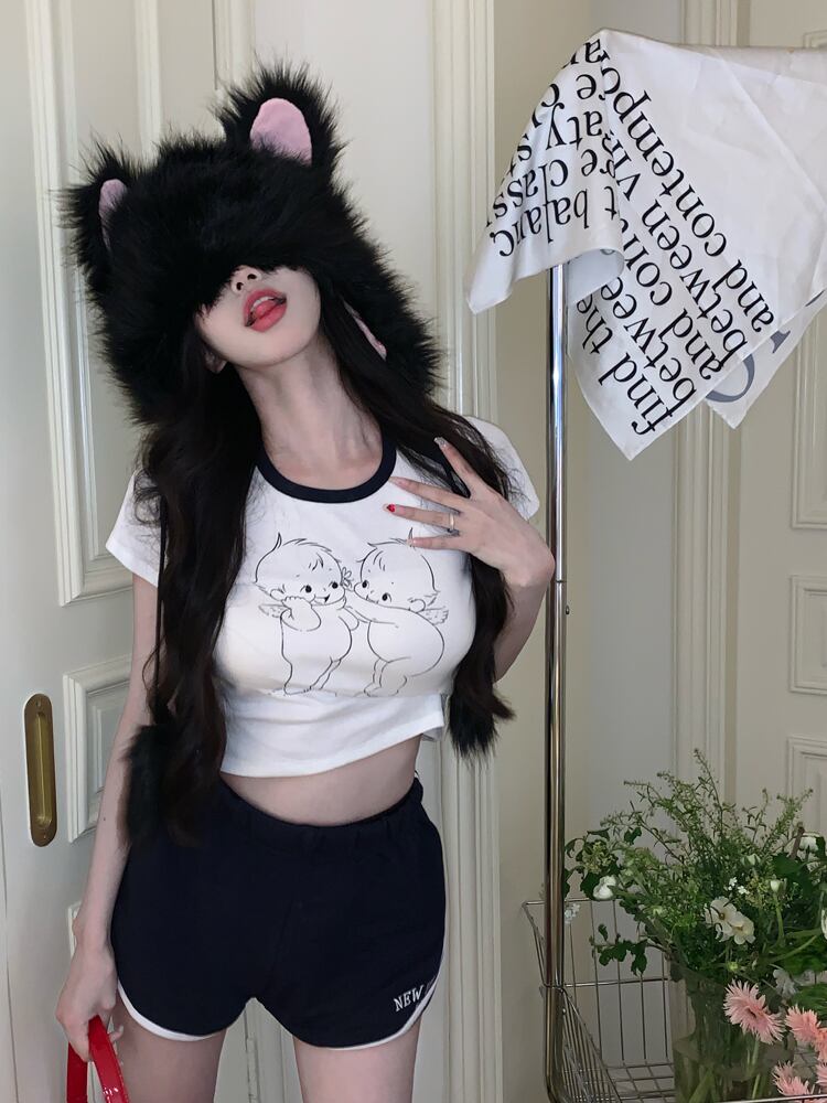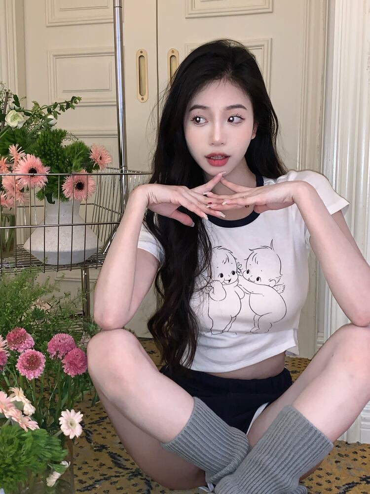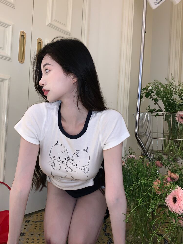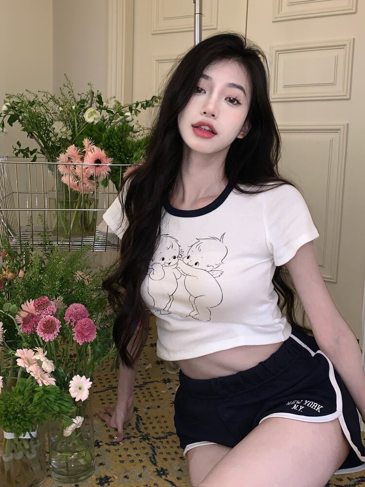 ホワイト スリム プリント 半袖 Tシャツ レディース 2022年夏 スパイスガールズ コントラストカラー スモールショートトップ ハーフスリーブ サマー 夏物 bstraw16235568576