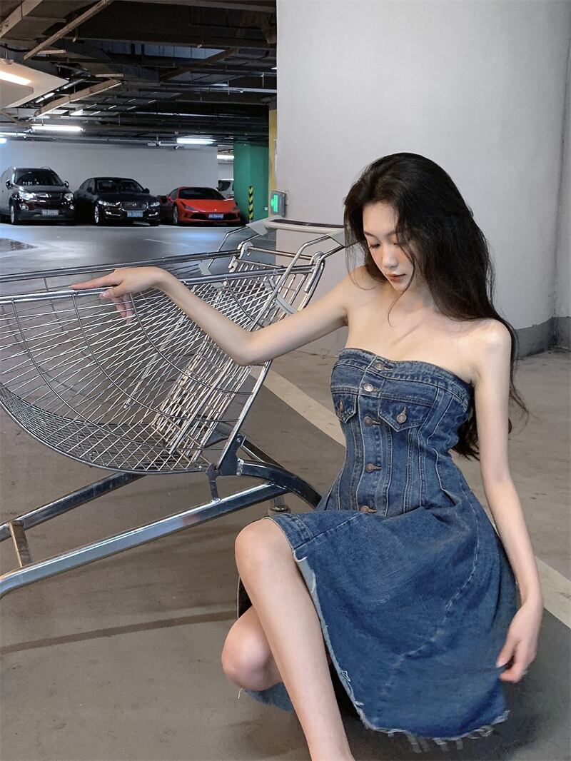 青いレトロなワンショルダー デニム チューブ トップ ドレス女性の夏のノースリーブ ハイエンド ウエスト ミドル丈スカート ブルー サマー 夏物 bstraw57578216448 | beaute25