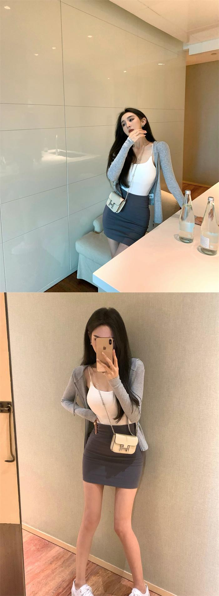 色:グレーのカーディガン,ブルーカーディガン,ホワイトサスペンダー,グレースカート,ネイビーブルーのスカート